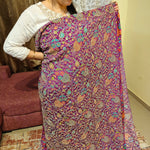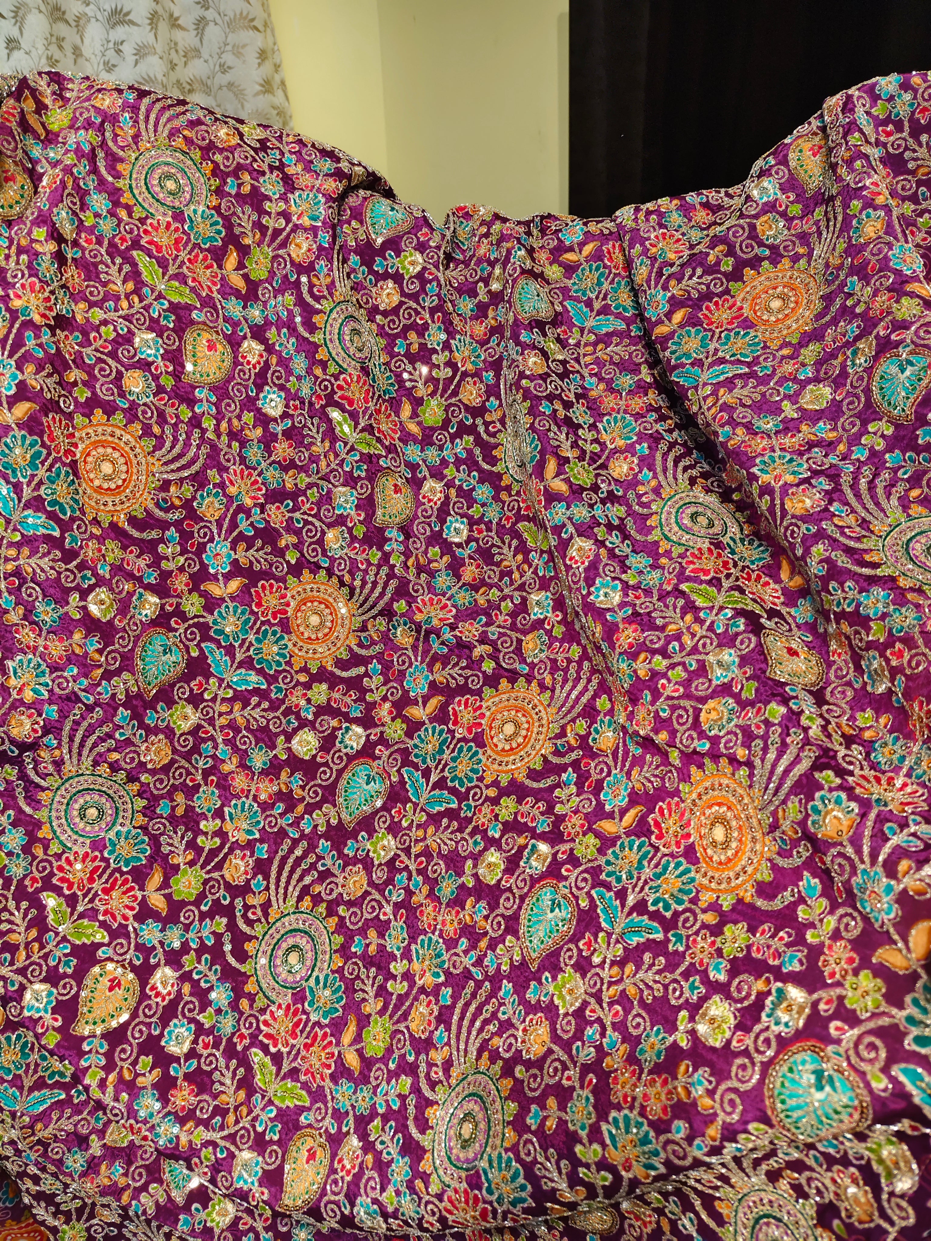 Royal Purple Crepe Silk Heavy Embellished Fabric with Gold Zari Floral Vines, Sequins and multicolored thread work . 1 Piece Length 4 meters width 1.2 meters
