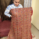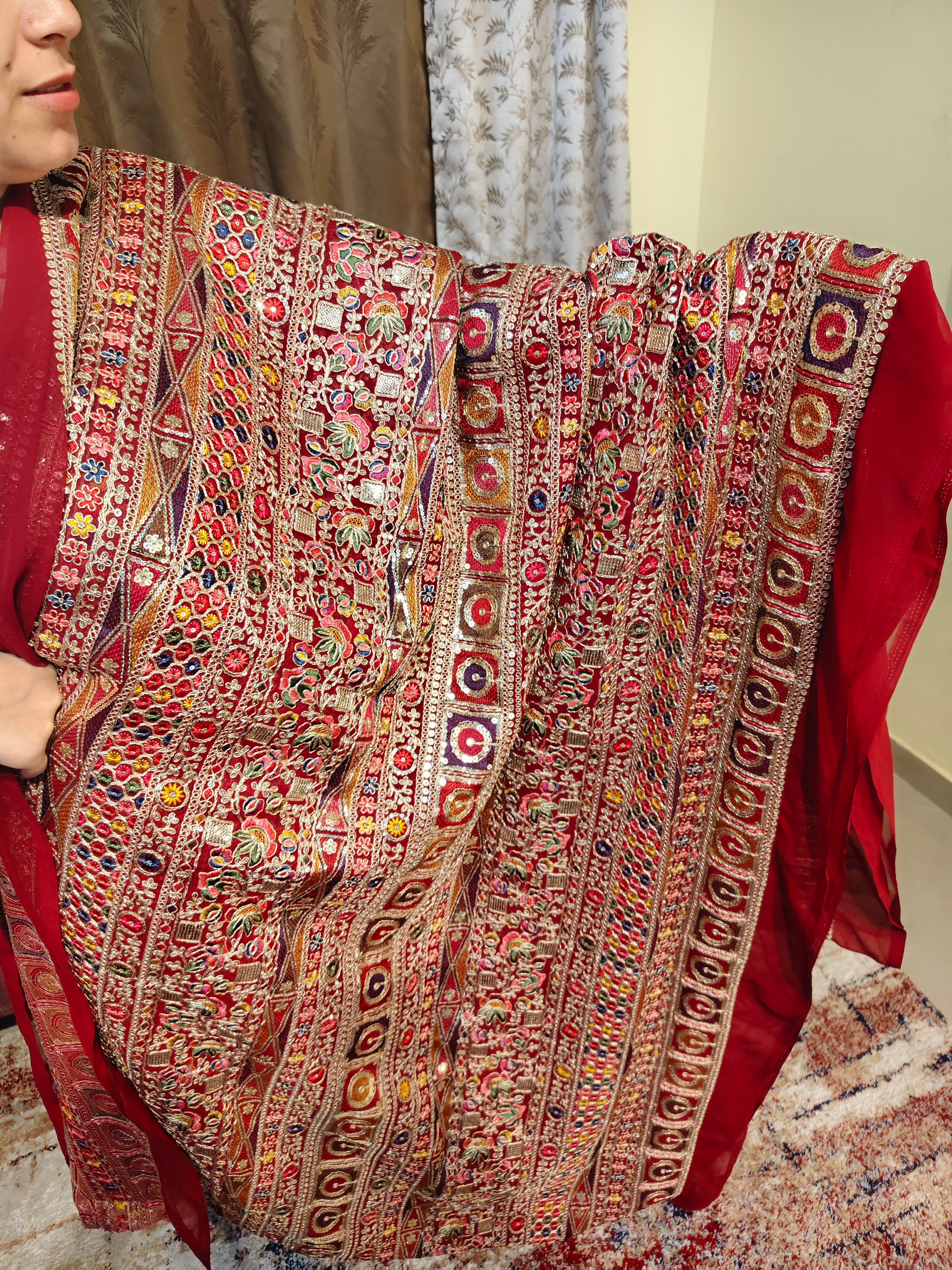 Rich Wine Red Heavy Embellished Georgette Fabric with multicolored thread work . Heavy Zari and sequins work. 1 Piece Length 4 meters width 1.2 meters