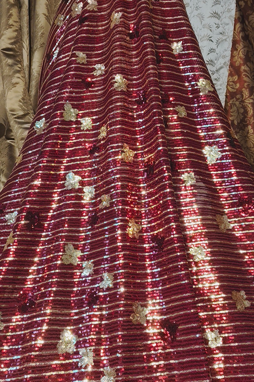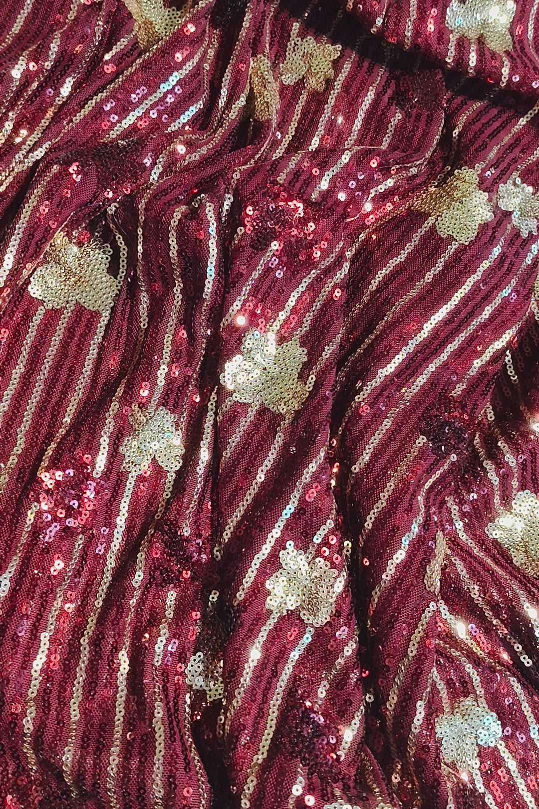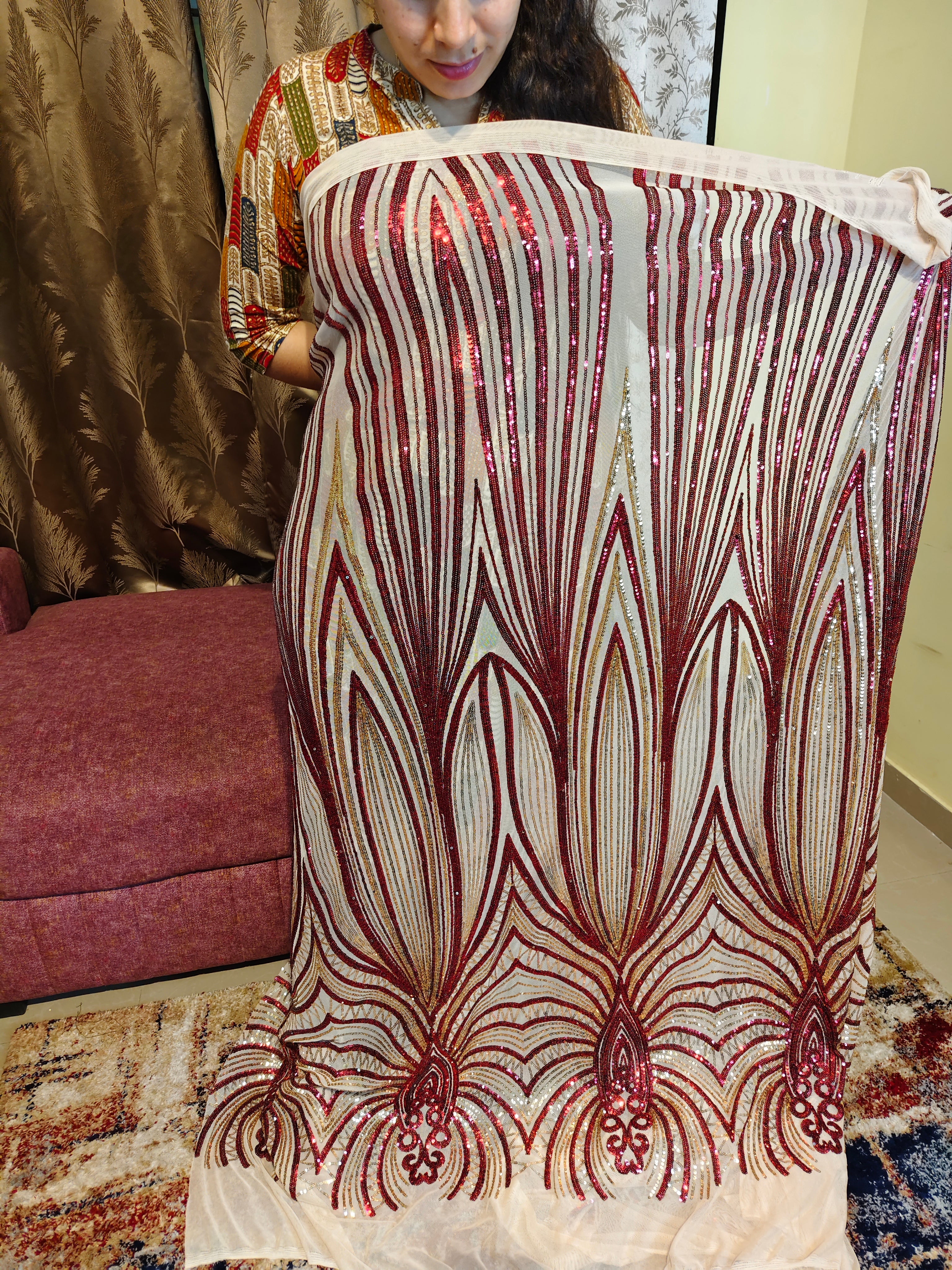 Warm Ivory & Wine Sequin Work Net Fabric with Gold Highlights