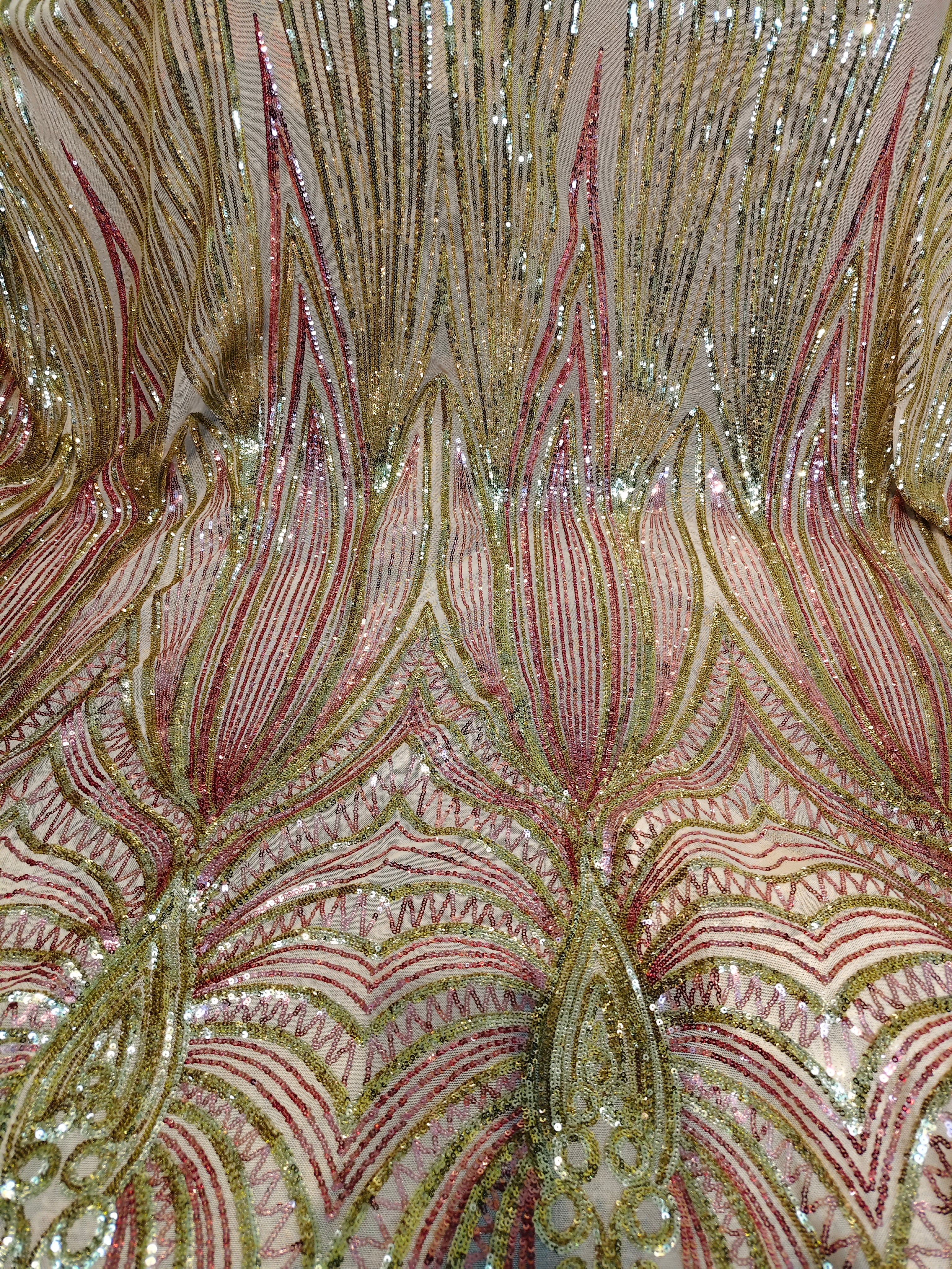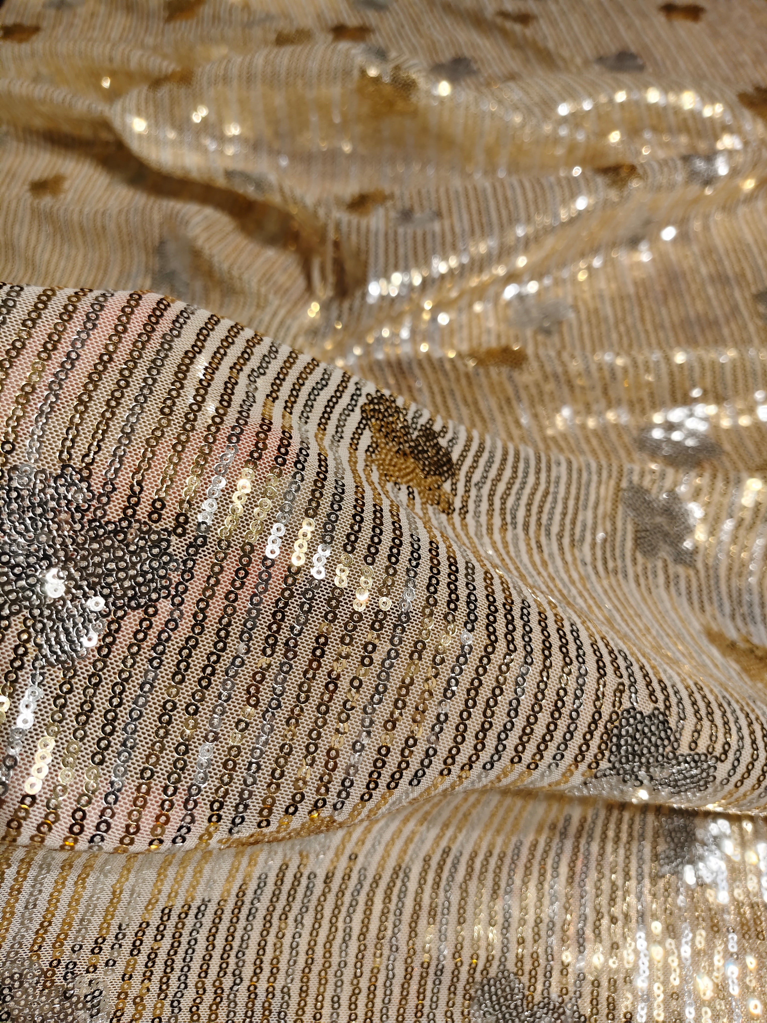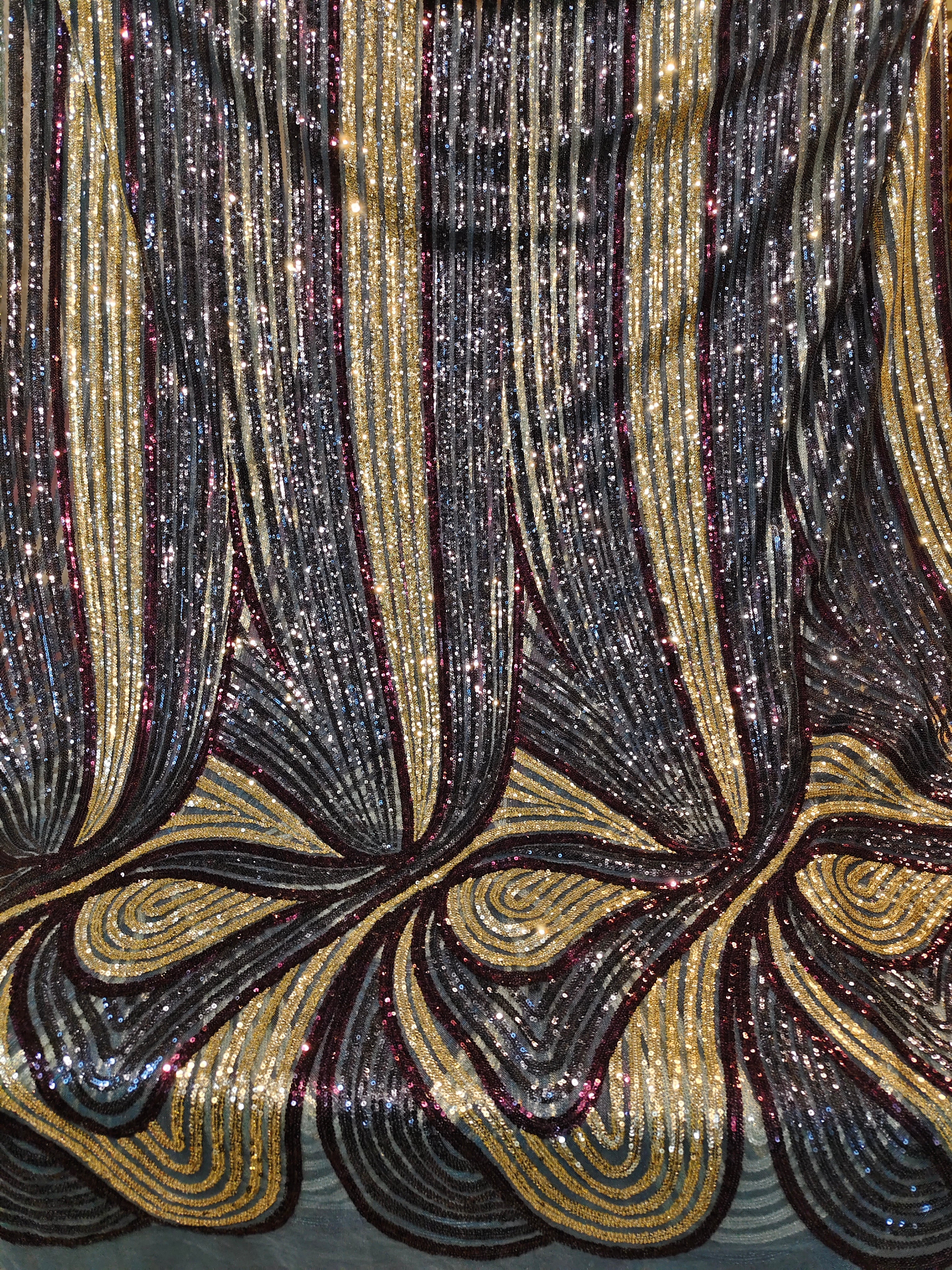 Warm Ivory & Wine Sequin Work Net Fabric with Gold Highlights