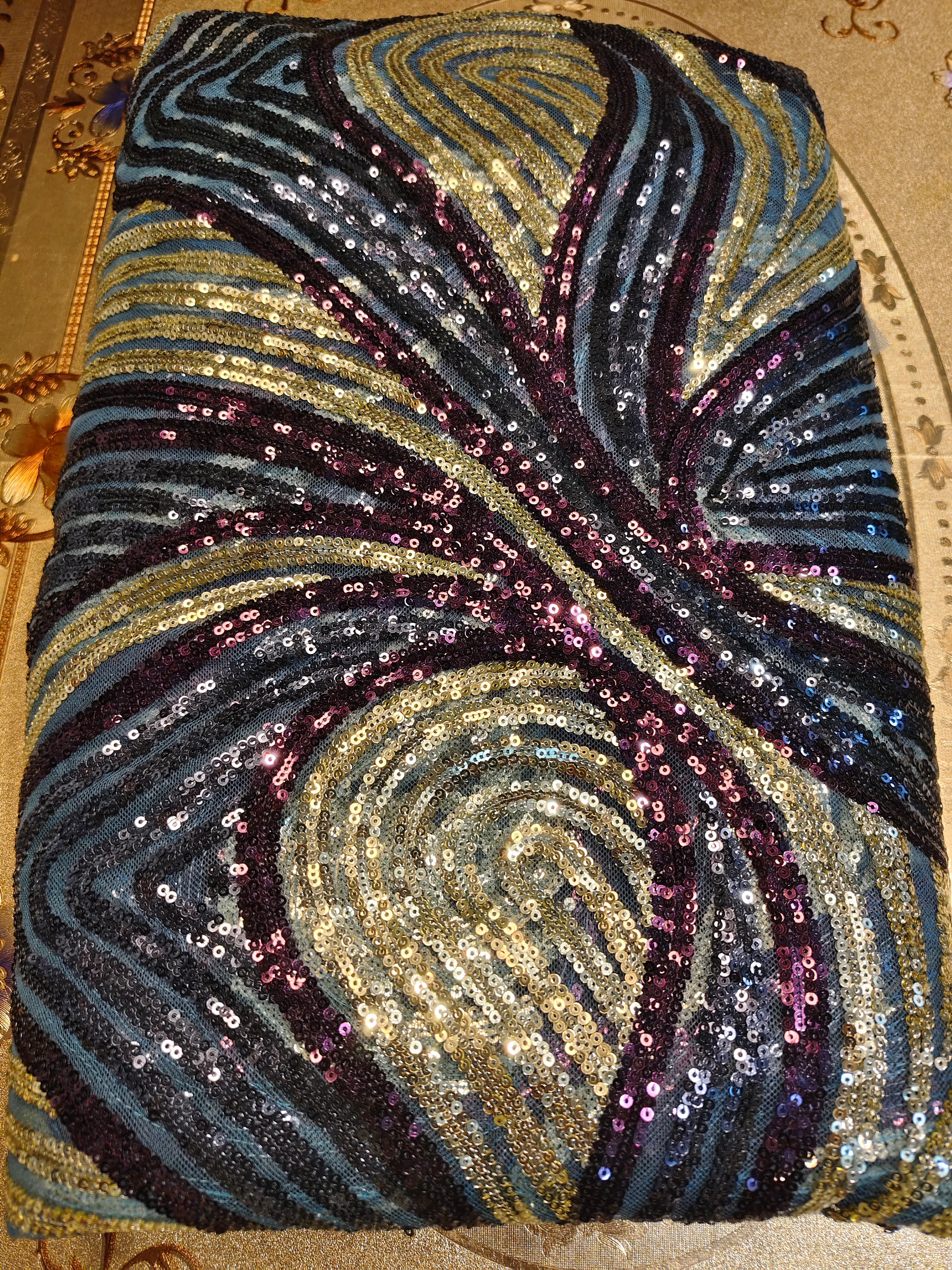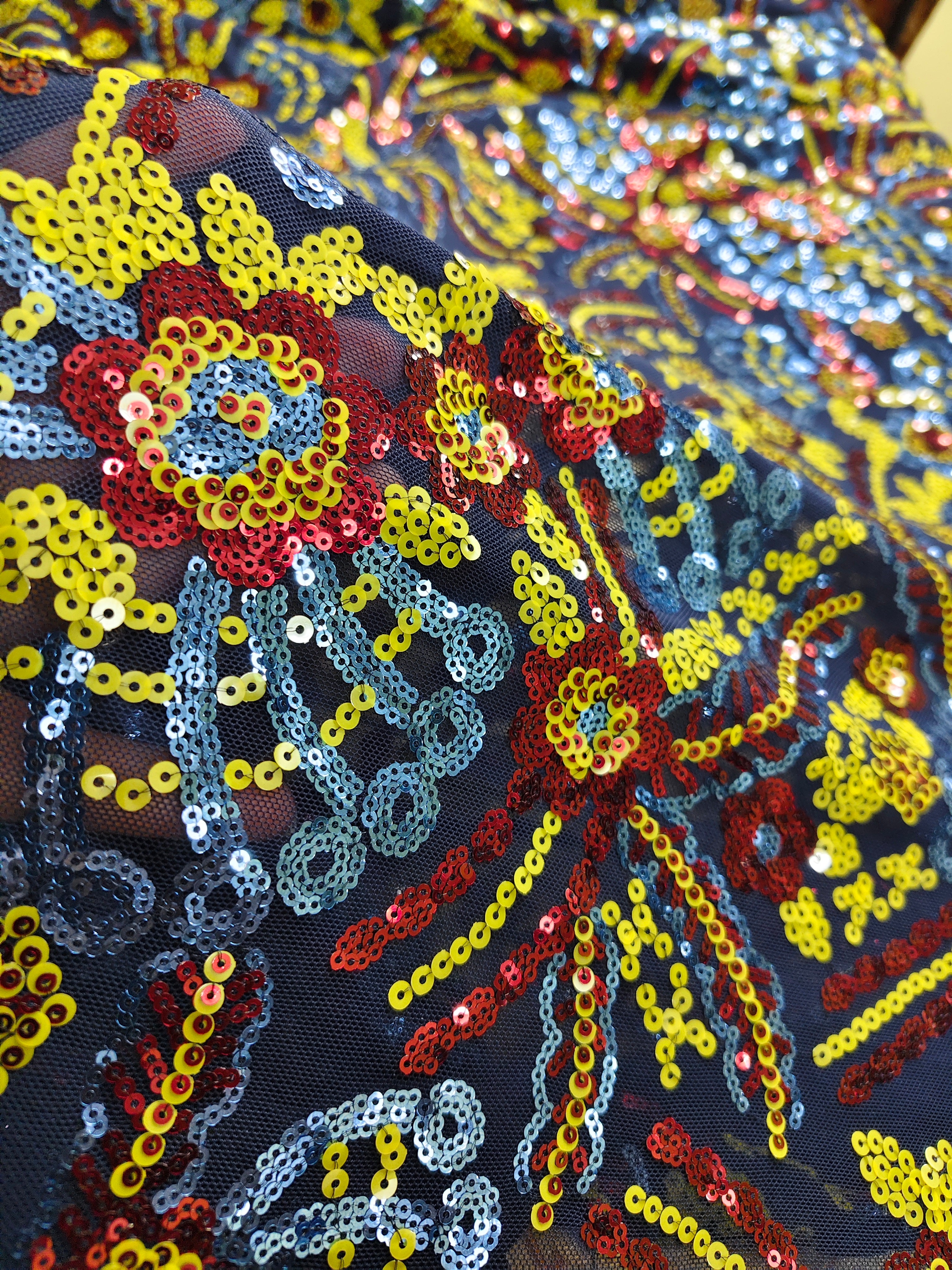 Deep Indigo & Gold Sequin Work Soft Net fabric
