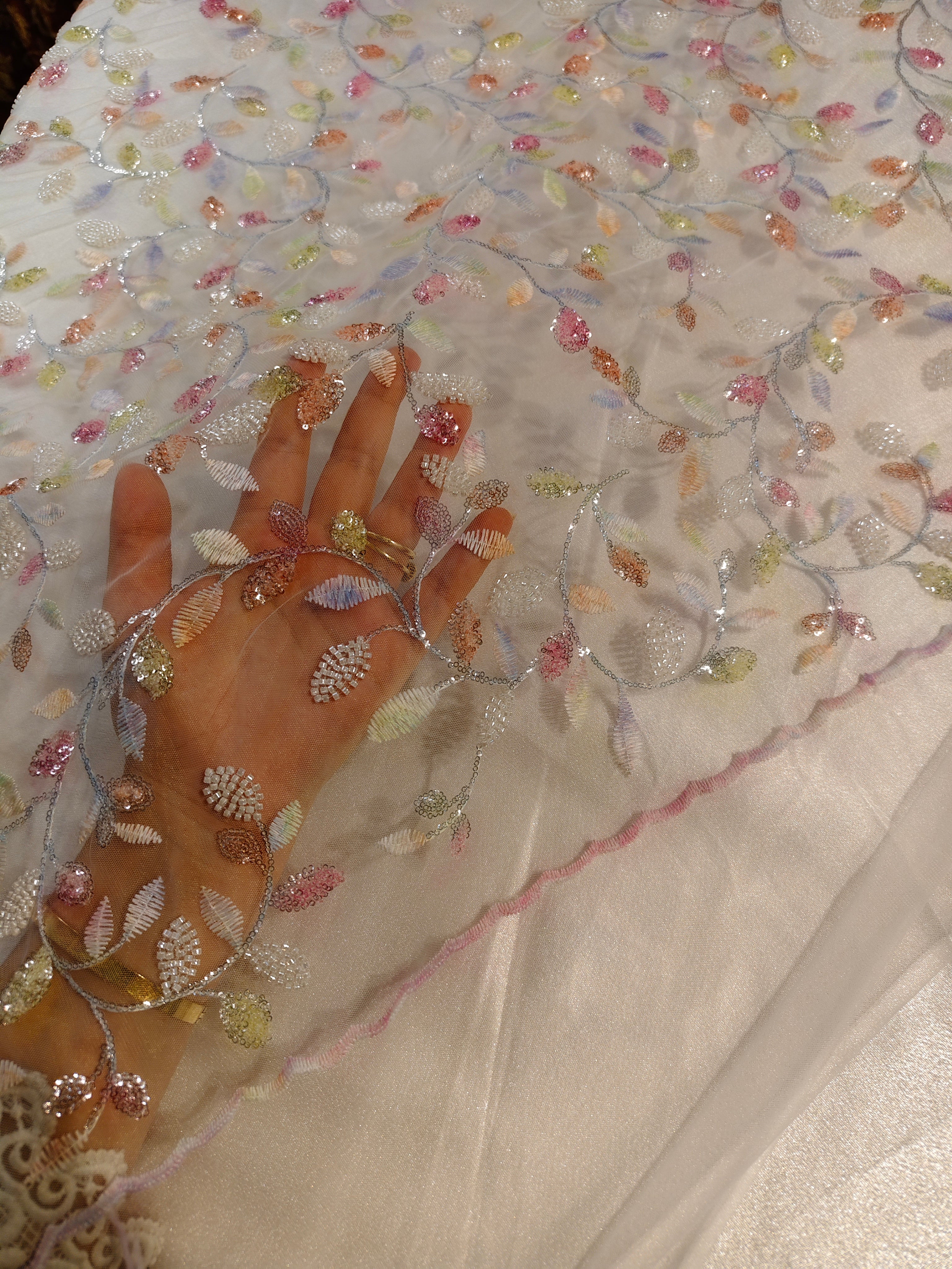 Pearl Ivory & Pastel Garden Embroidered Net Fabric