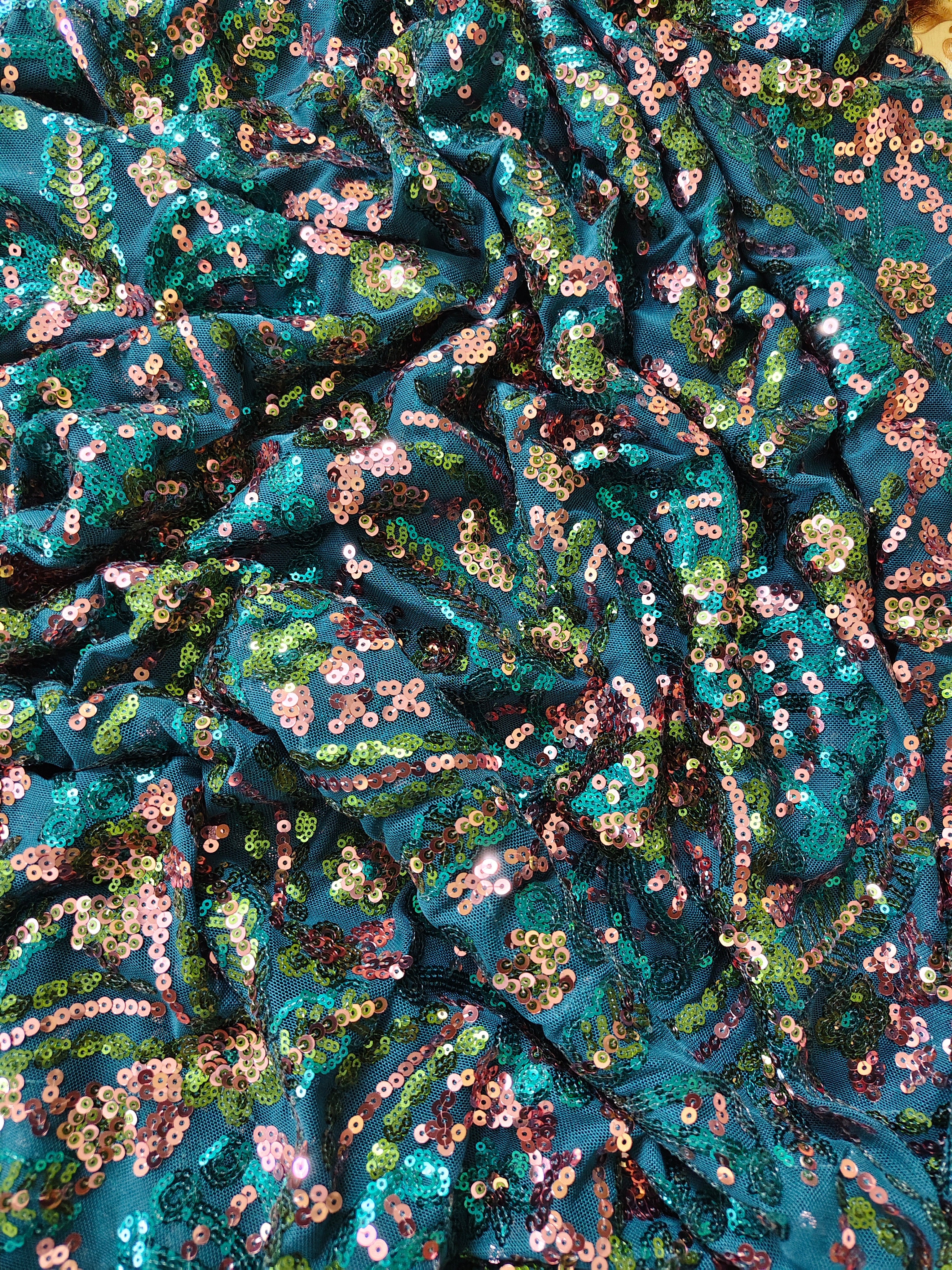 Deep Emerald & Gold Wave Sequin Net Fabric
