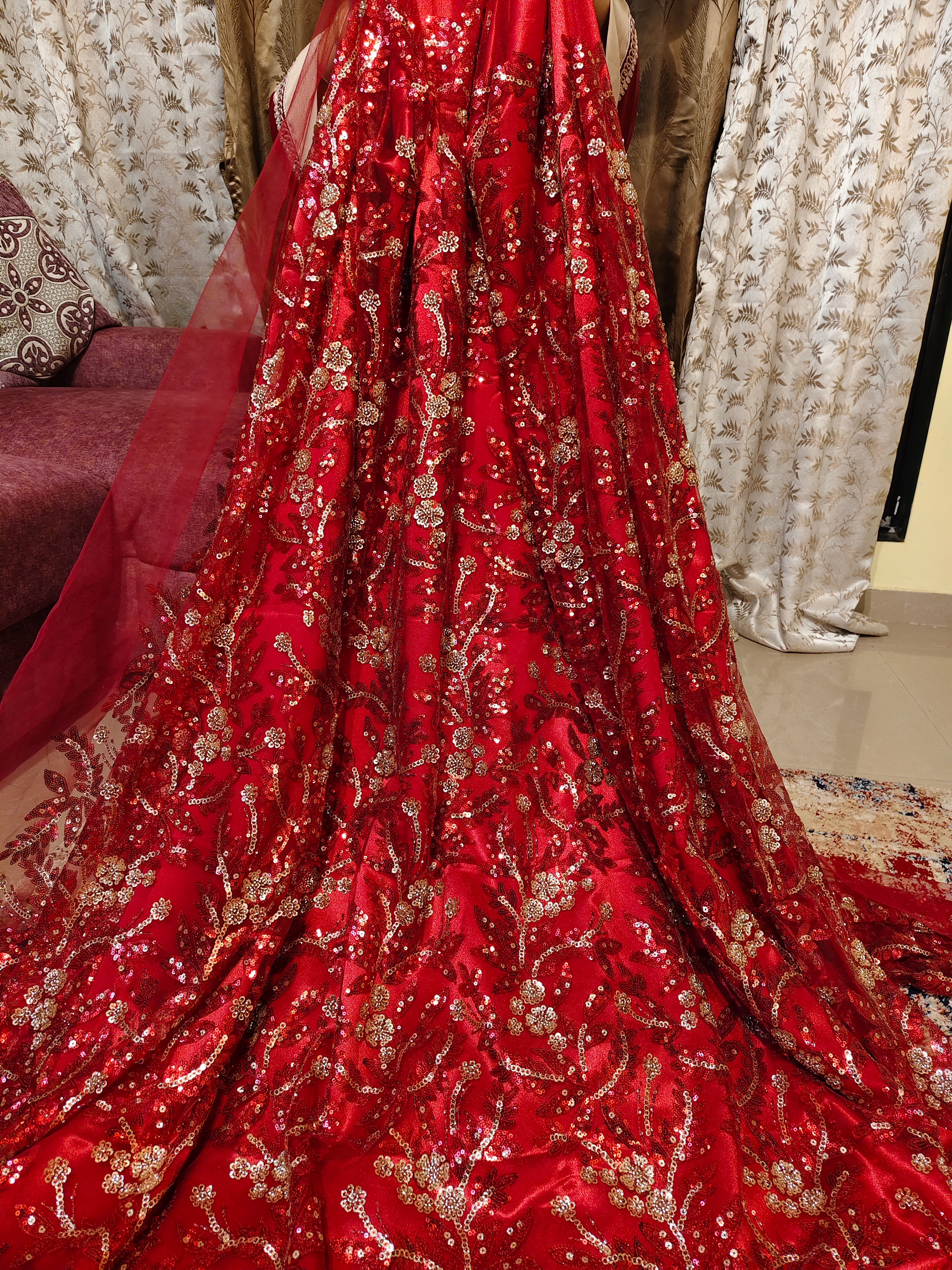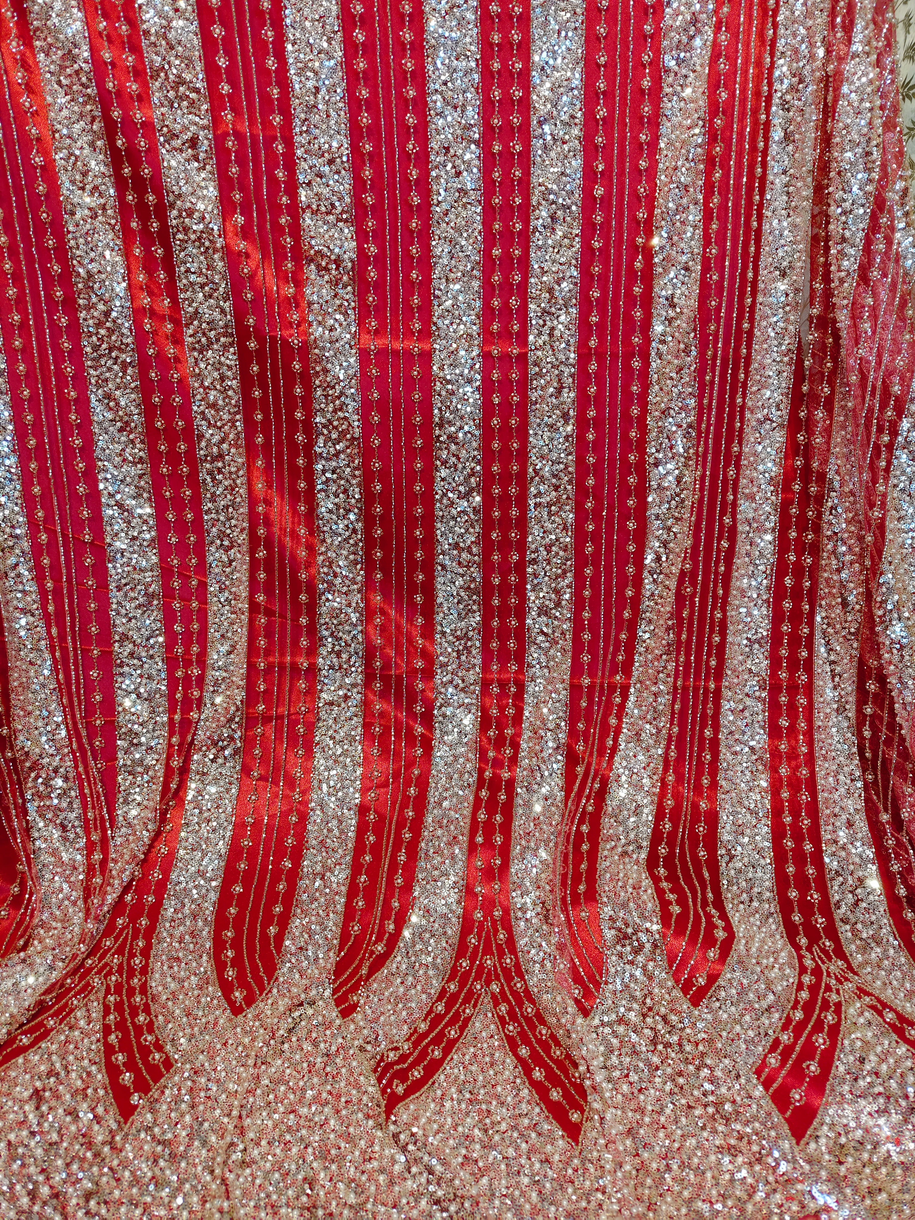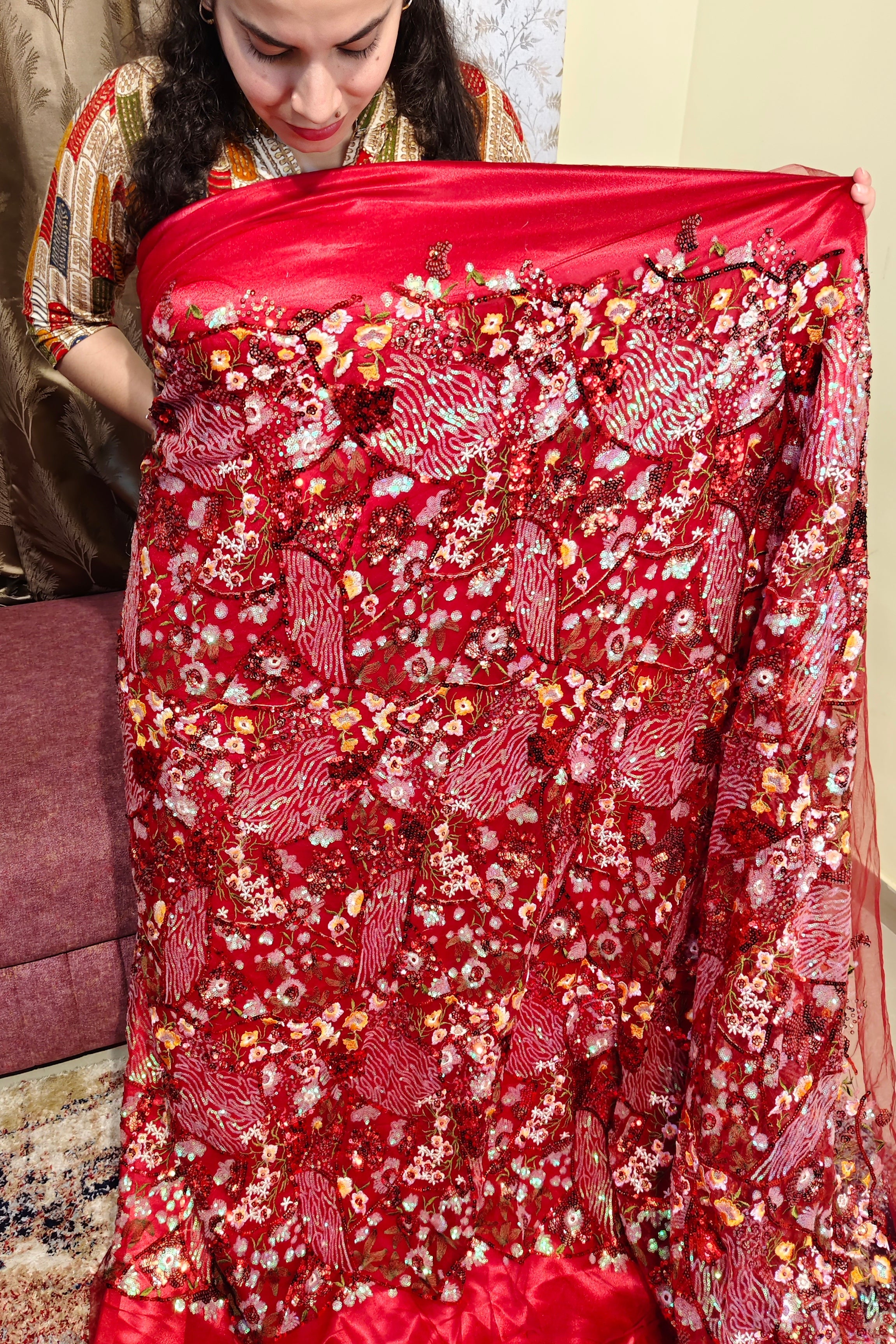 Vibrant Red Silk Satin Backed heavy handwork Net Fabric