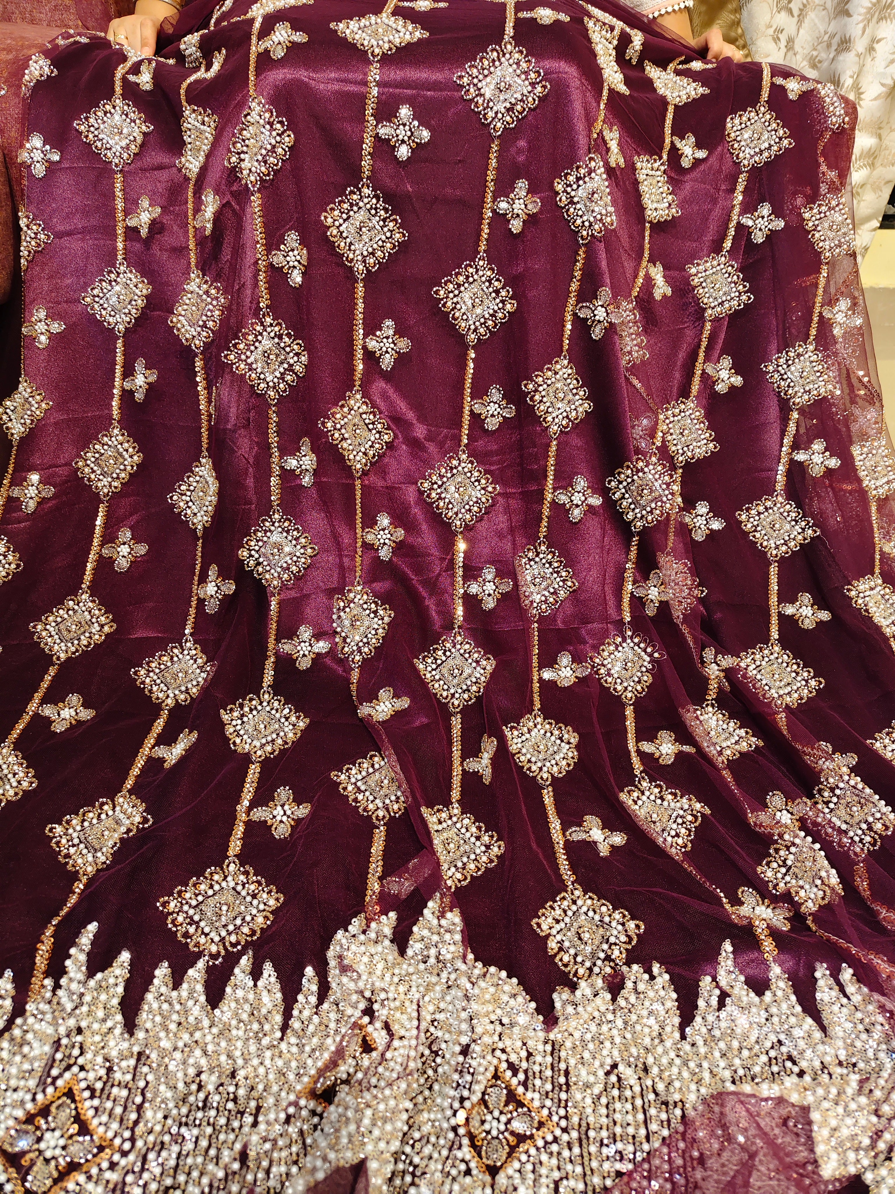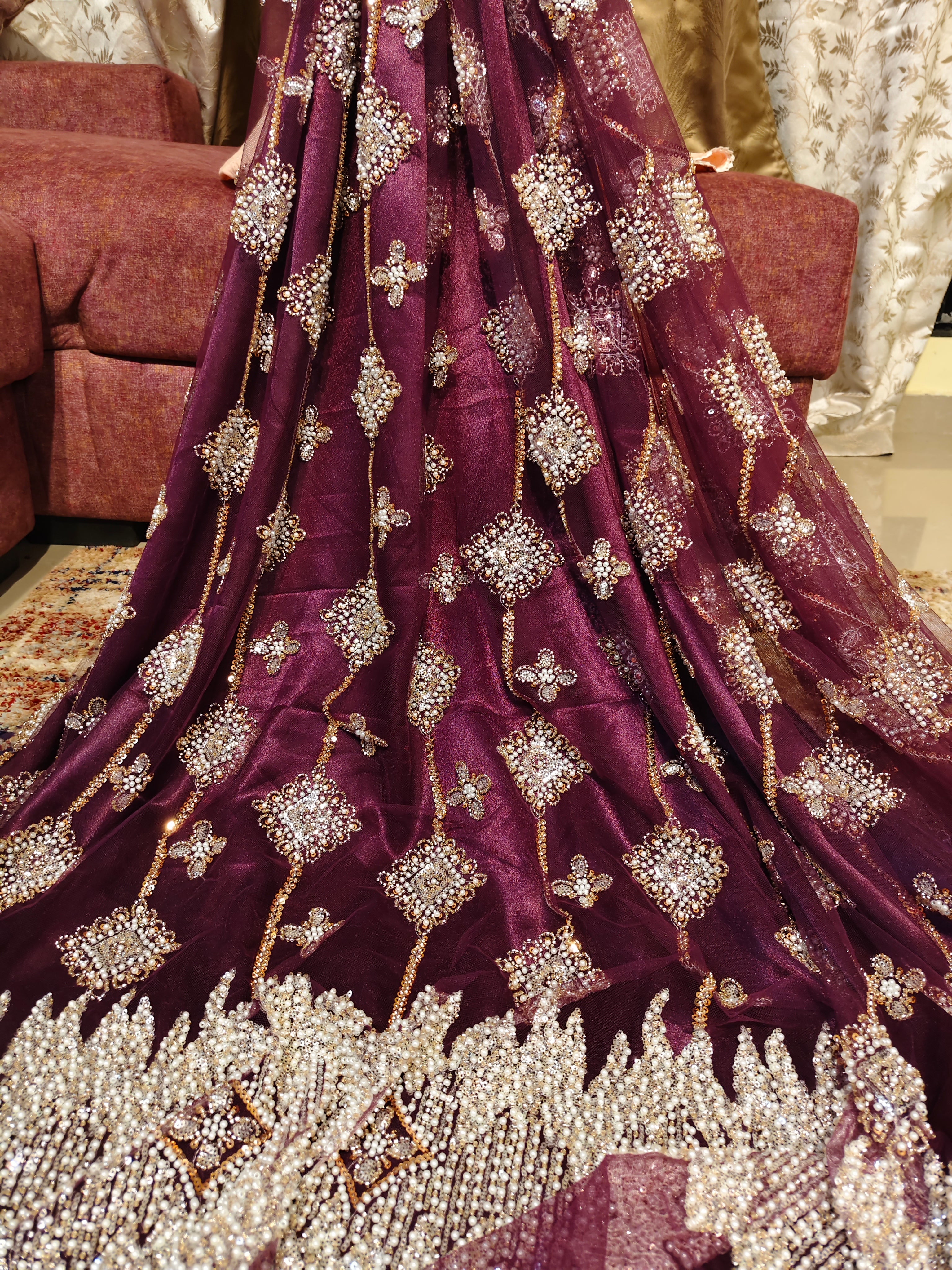 Deep Wine Embellished Net Fabric backed with Silk Satin