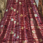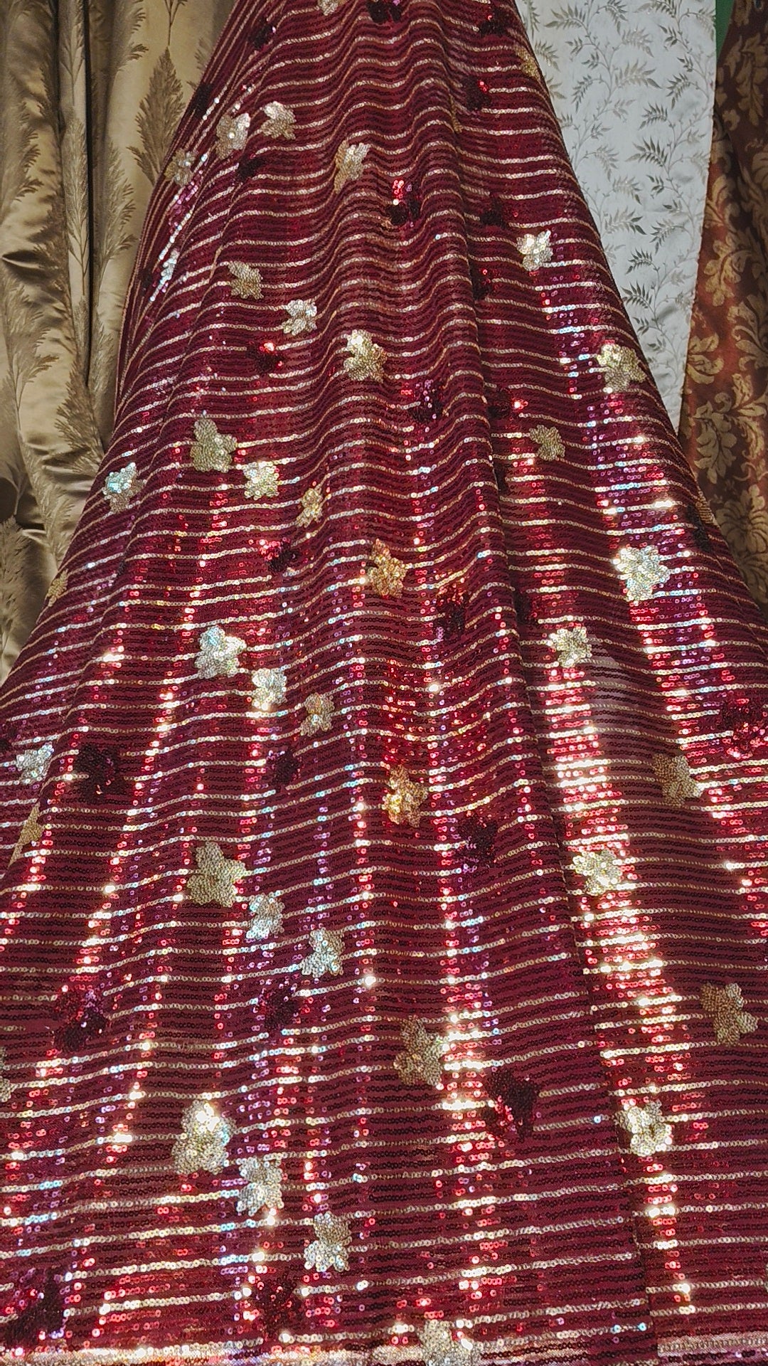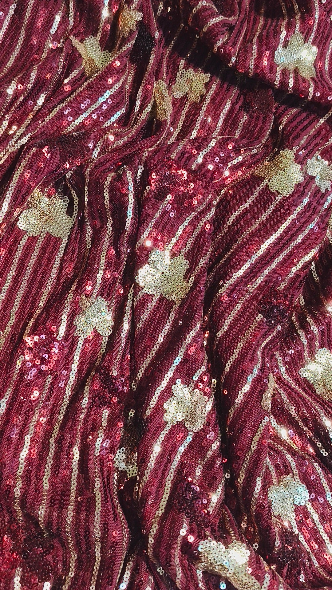 Burgundy net with antique gold floral sequin work and shimmering stripes — made for grand festive couture.1 Piece Length 3.5 meters width 1.5 meters