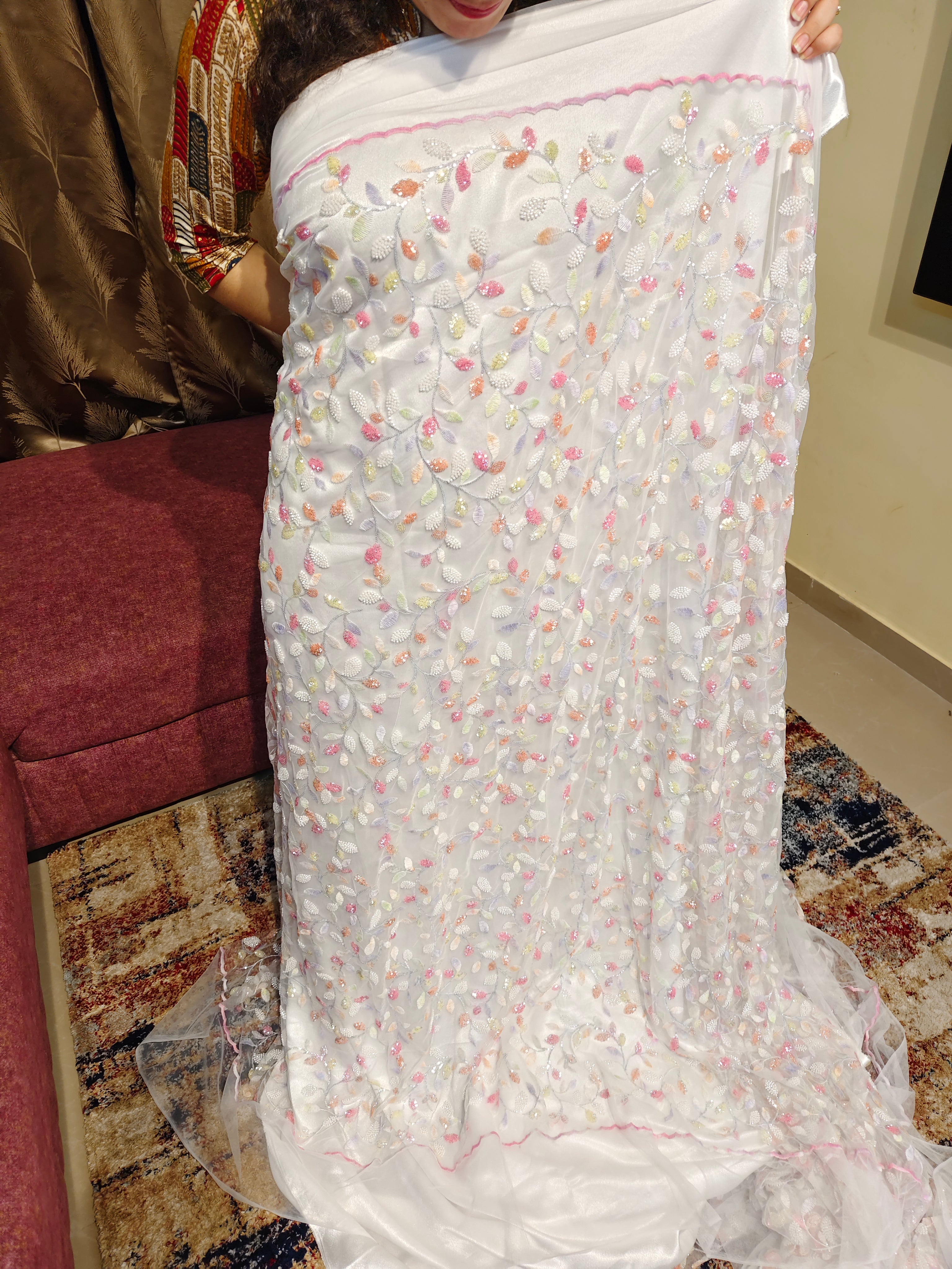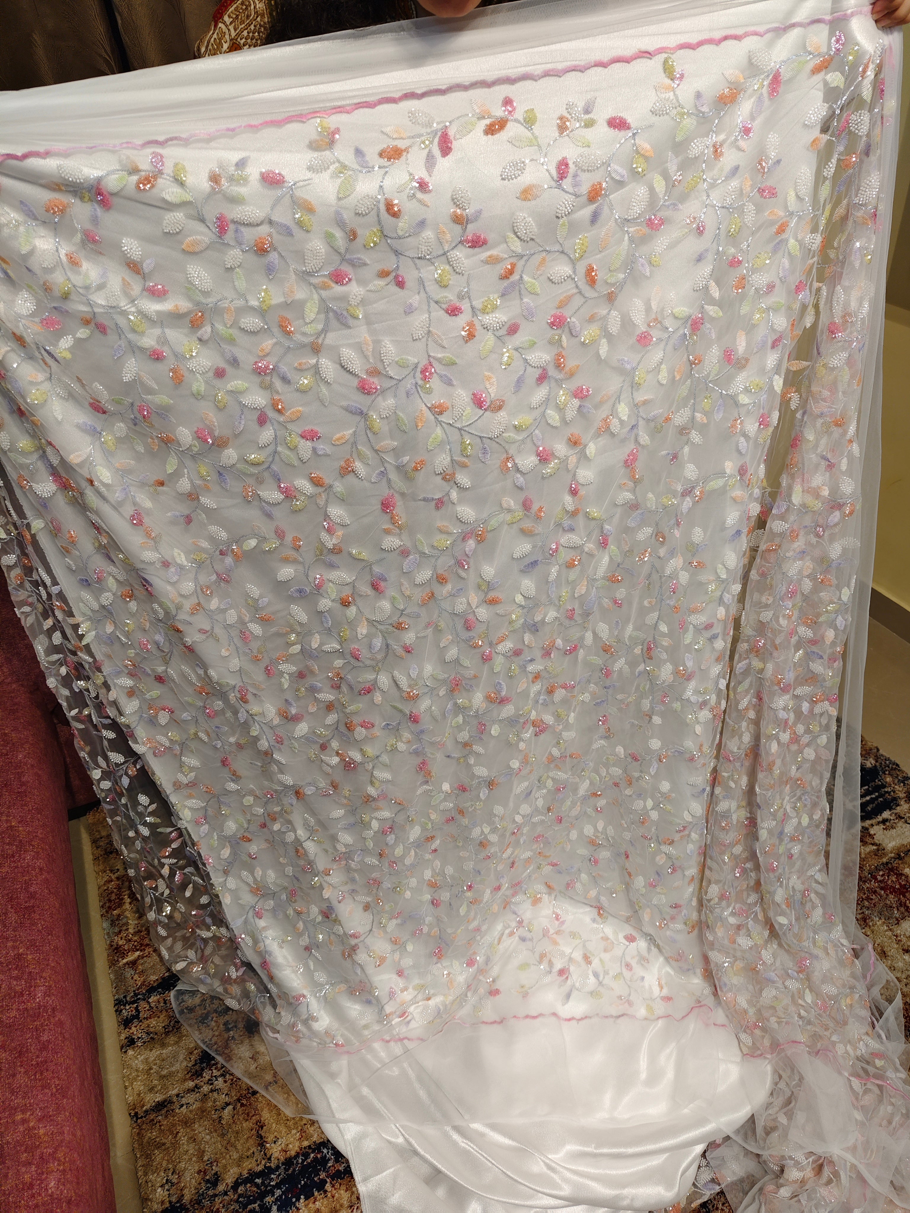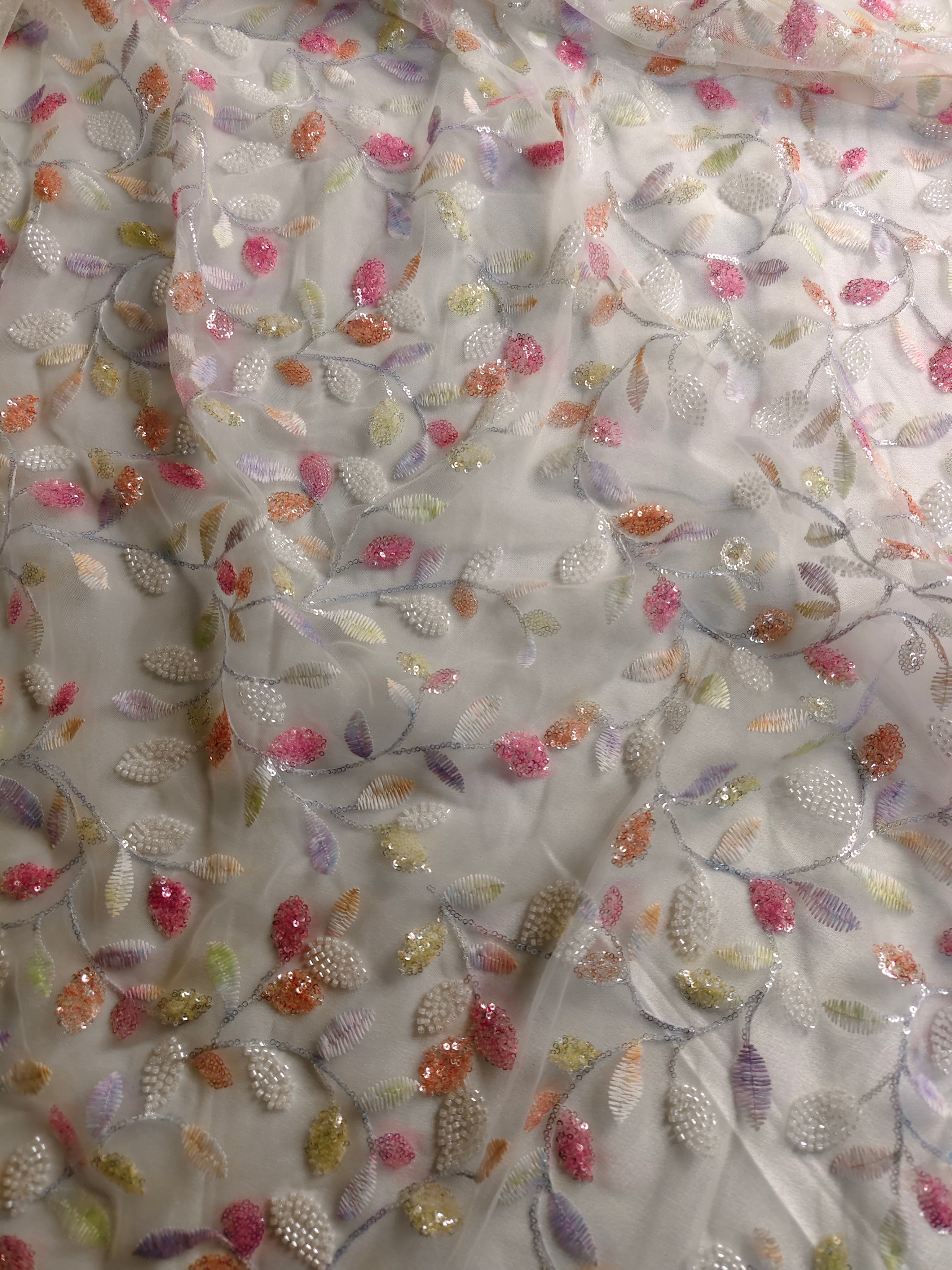 A soft ivory net fabric delicately embroidered with multicoloured pastel floral vines and leaf motifs with beads, finished with subtle sequins shimmer for a luminous touch. Perfect for elegant kaftans or takchetas , and refined daytime couture. 2 Pieces length 4 meters width 1.5 meters