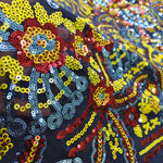 A deep navy sequin net fabric with vibrant multicolour detailing, crafted for bold festive and couture creations. Striking, artistic, unforgettable. 1 Piece Length 3.5 meters width 1.5 meters