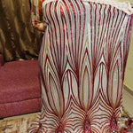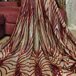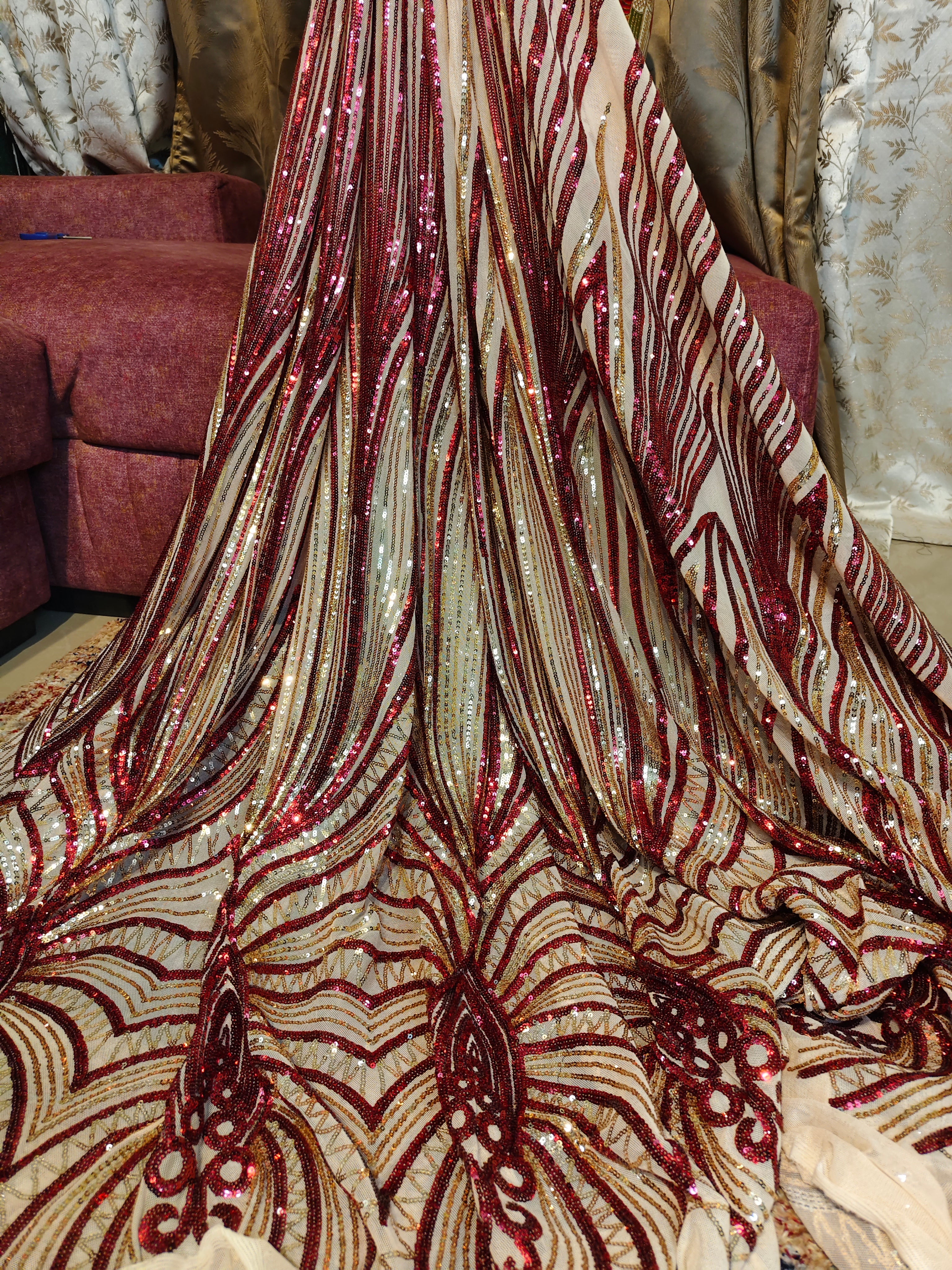 A champagne ivory soft net fabric richly embellished with ruby-wine sequins and antique gold highlights, crafted in vertical shimmer trails and dramatic art-deco feather motifs. Designed for reception couture, bridal evenings, and grand festive creations. 1 Piece Length 4 meters width 1.5 meters