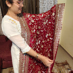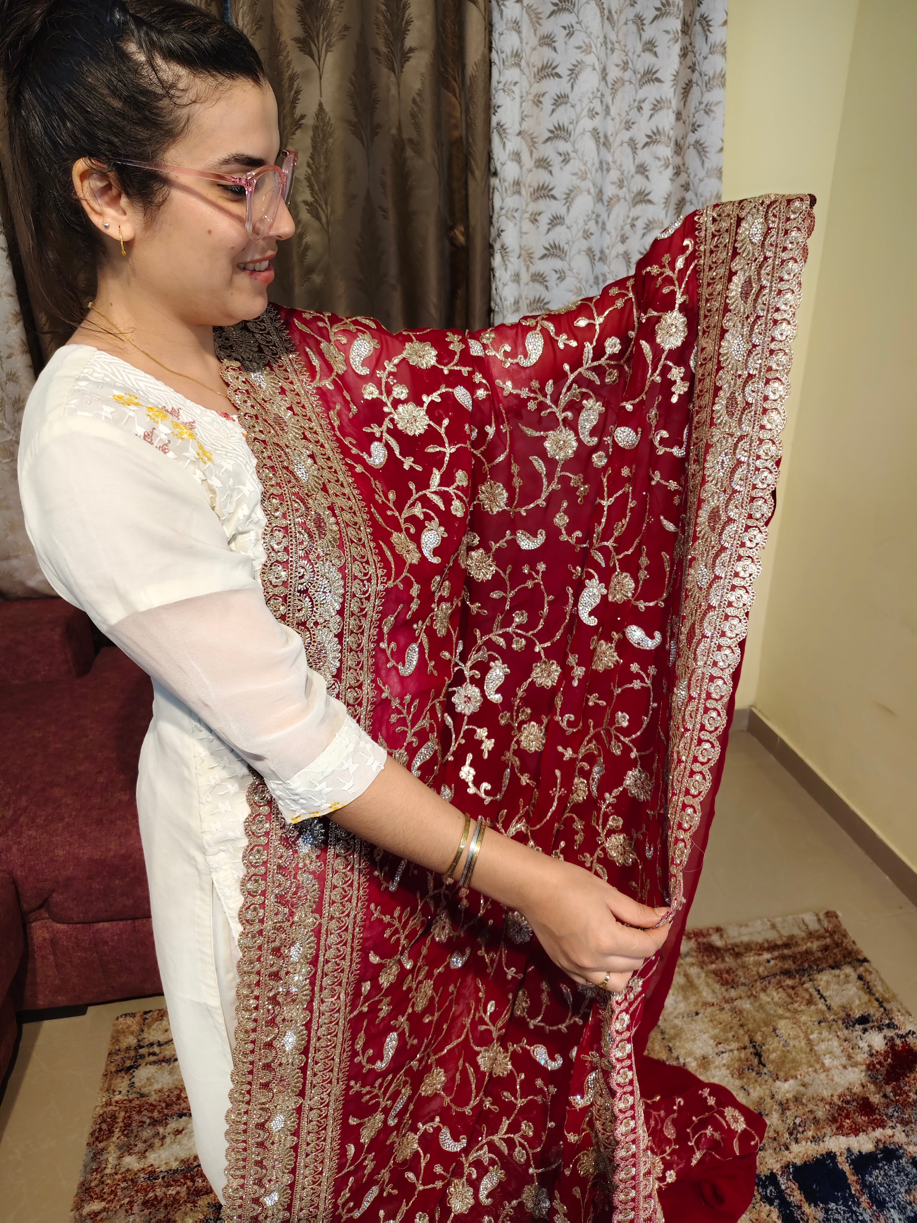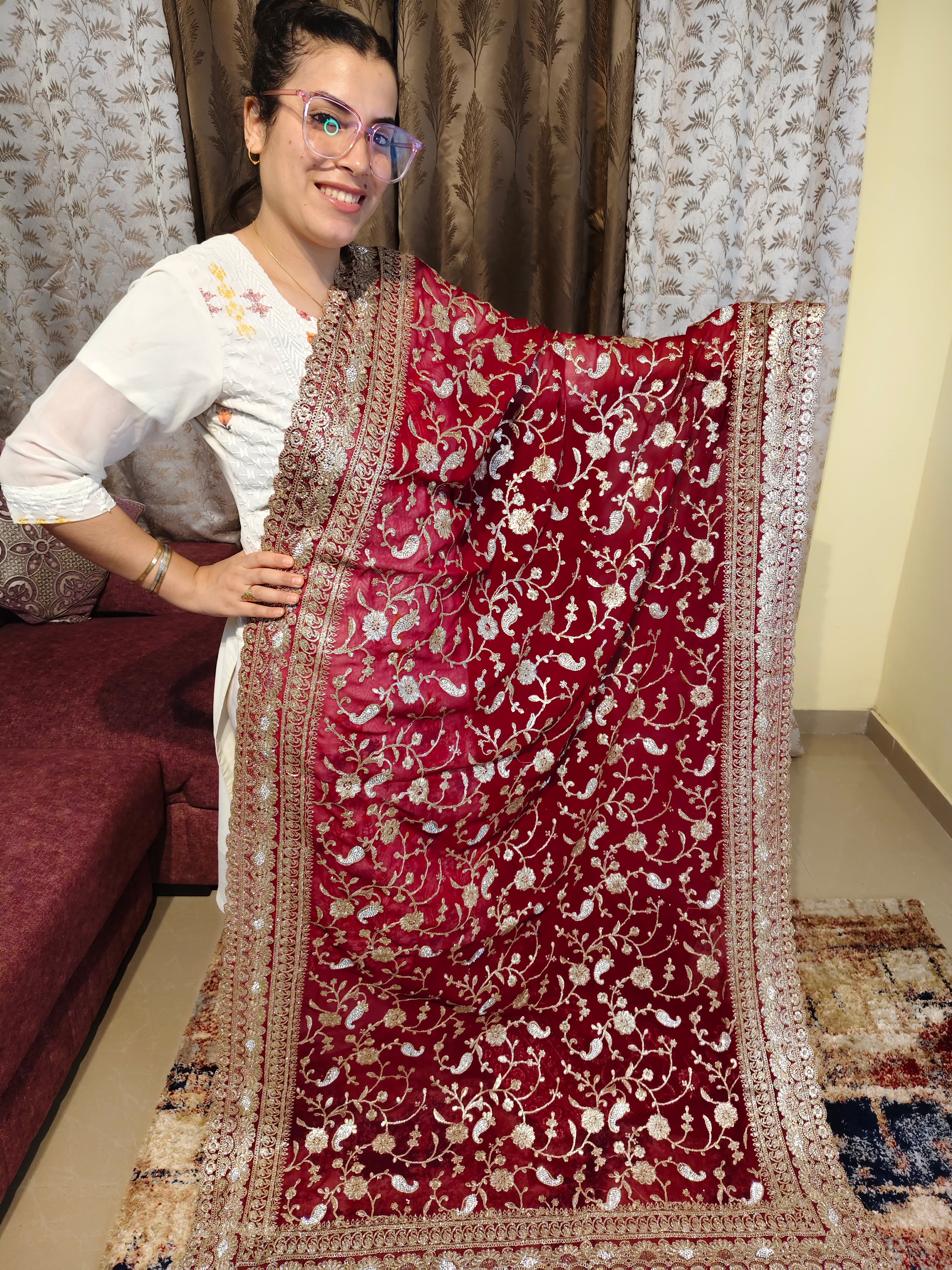 Dark Red Georgette Saree with Heavy Gold Zari Floral Border. Full heavy embroidery work of Gold Zari and embellished with crystals. 1 Piece Length 6 meters width 1.1 meters