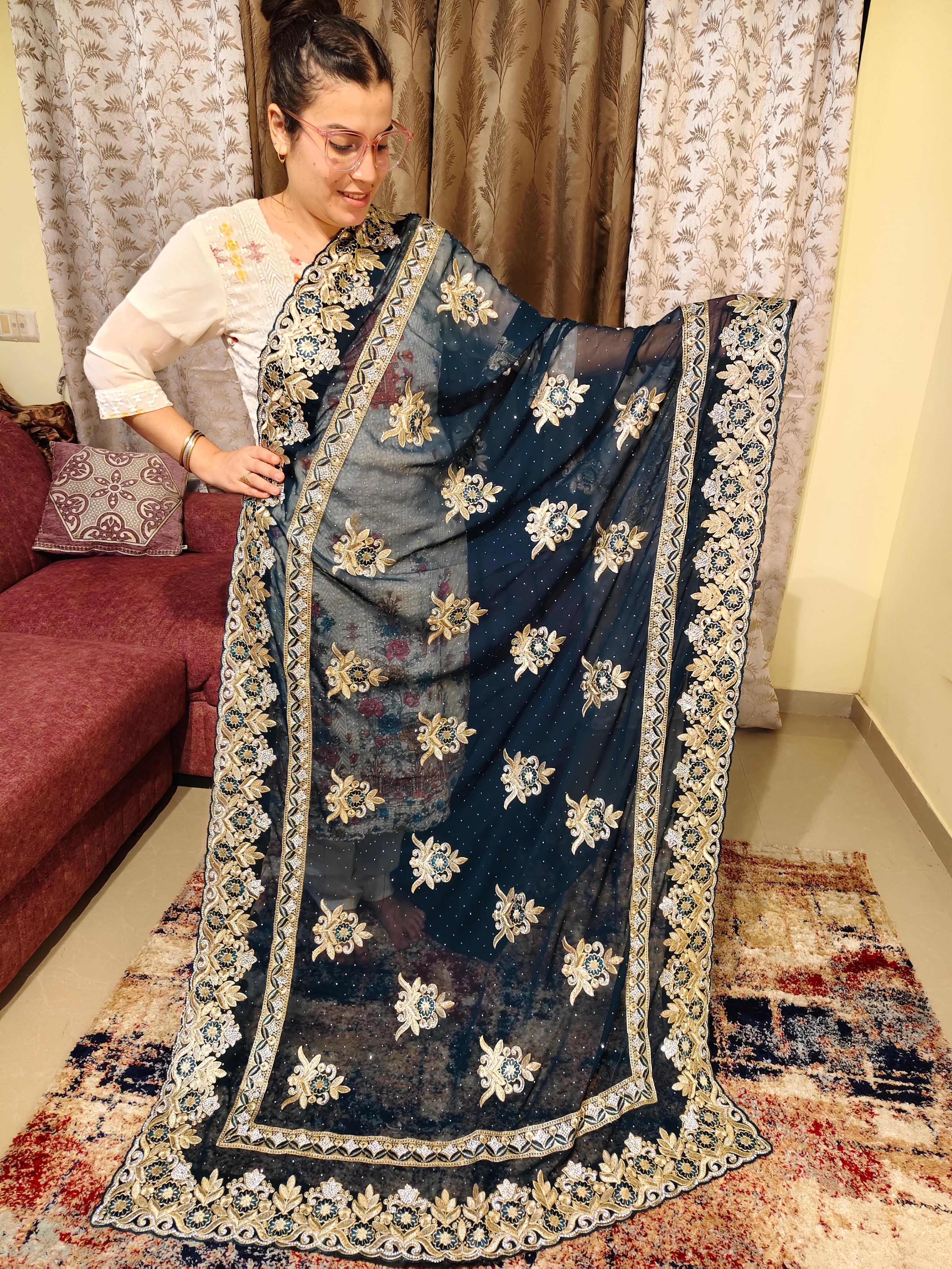 Midnight Blue georgette Saree with Dense Gold Zari handwork Border and embellished with crystals . 1 Piece Length 6 meters width 1.1 meters