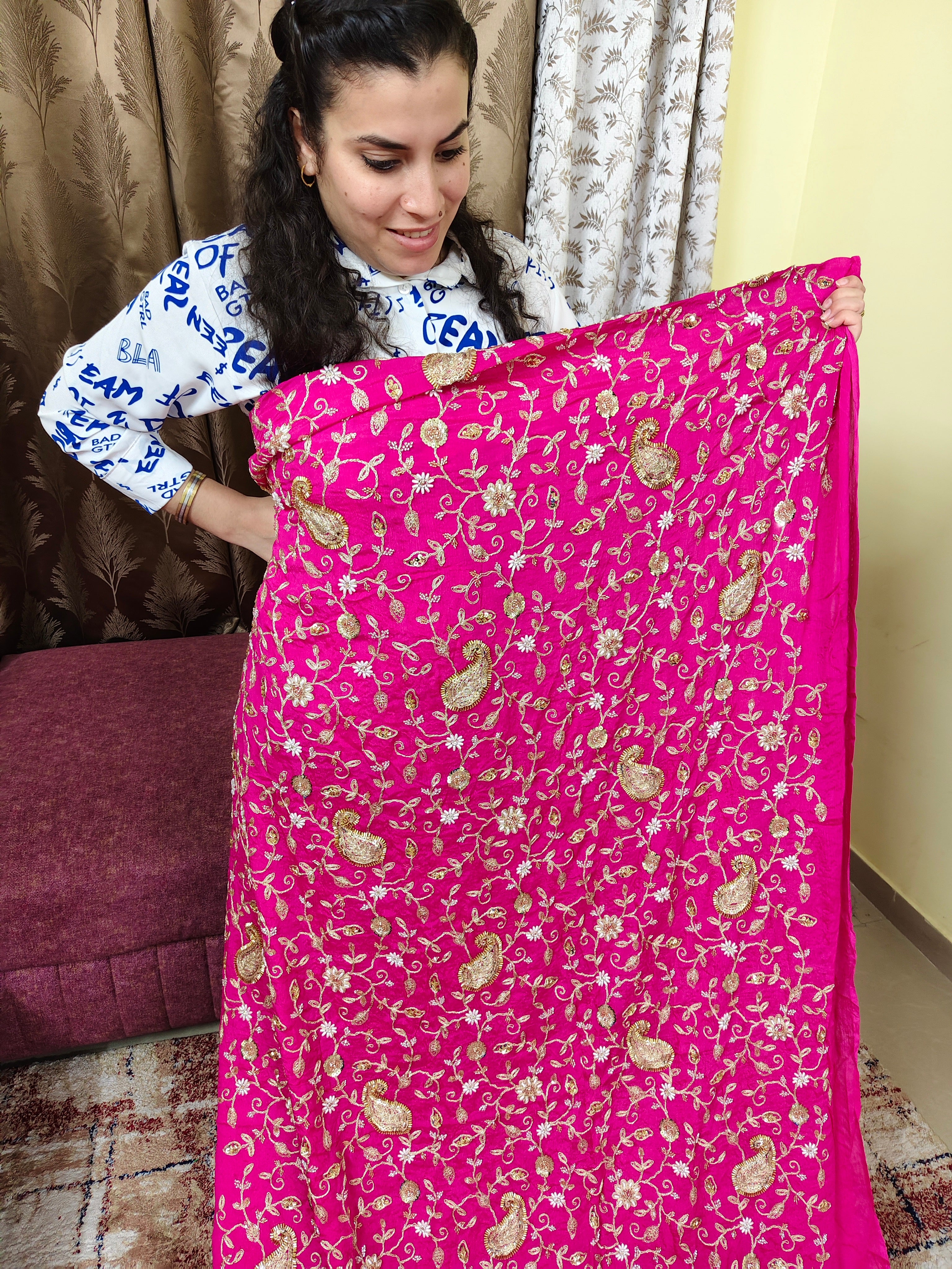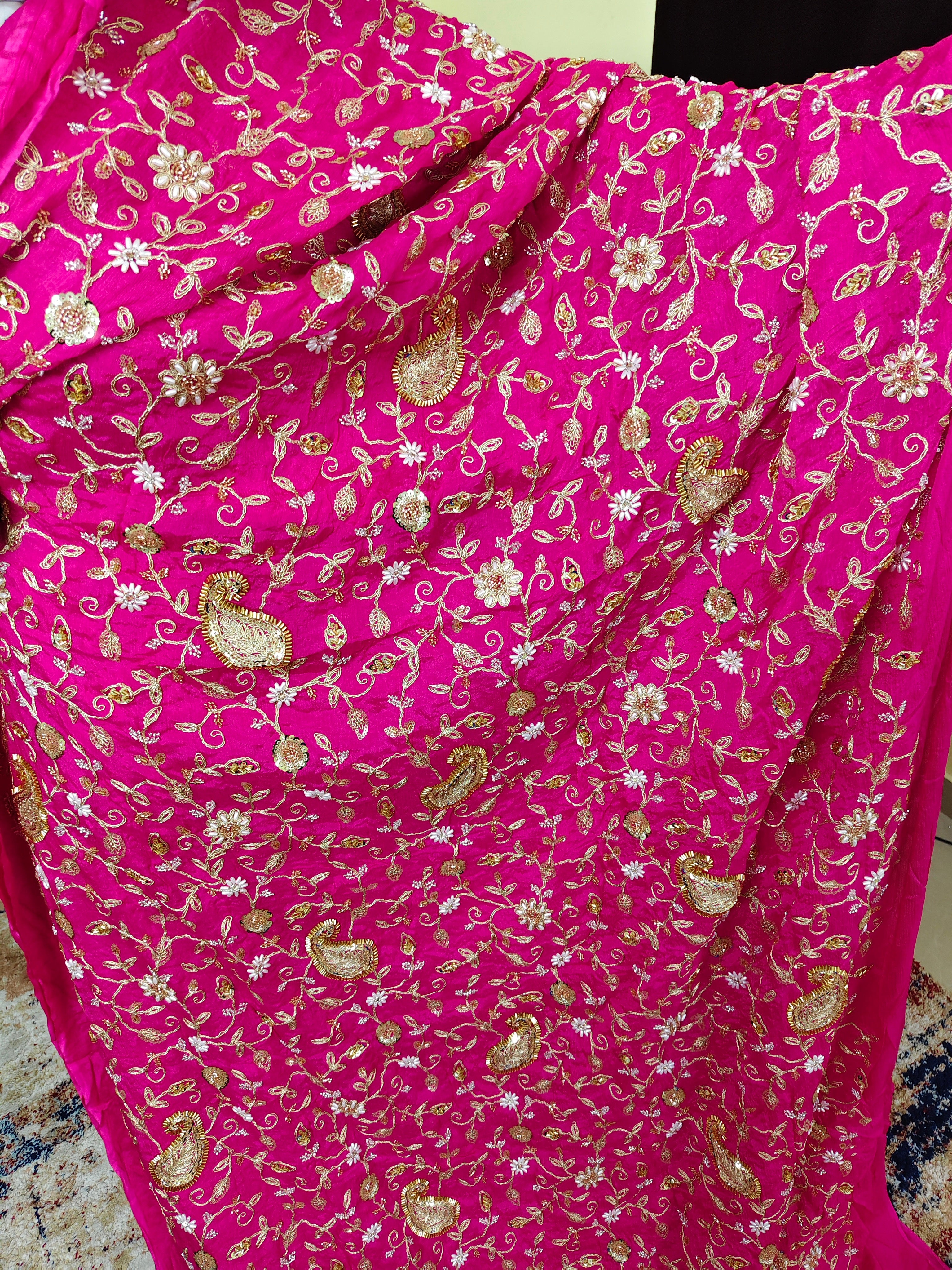Hot Pink Zari Embroidered Chiffon Fabric