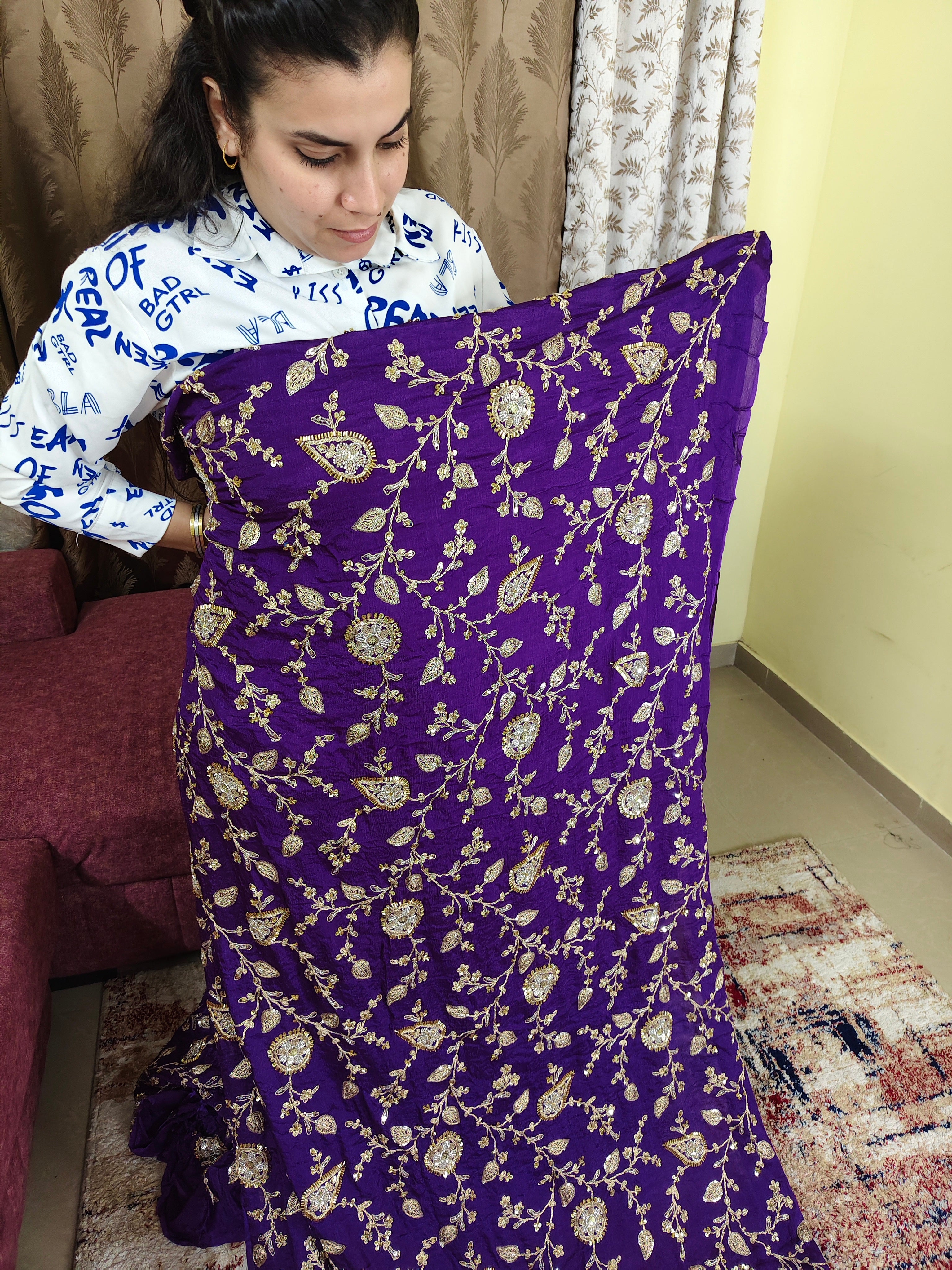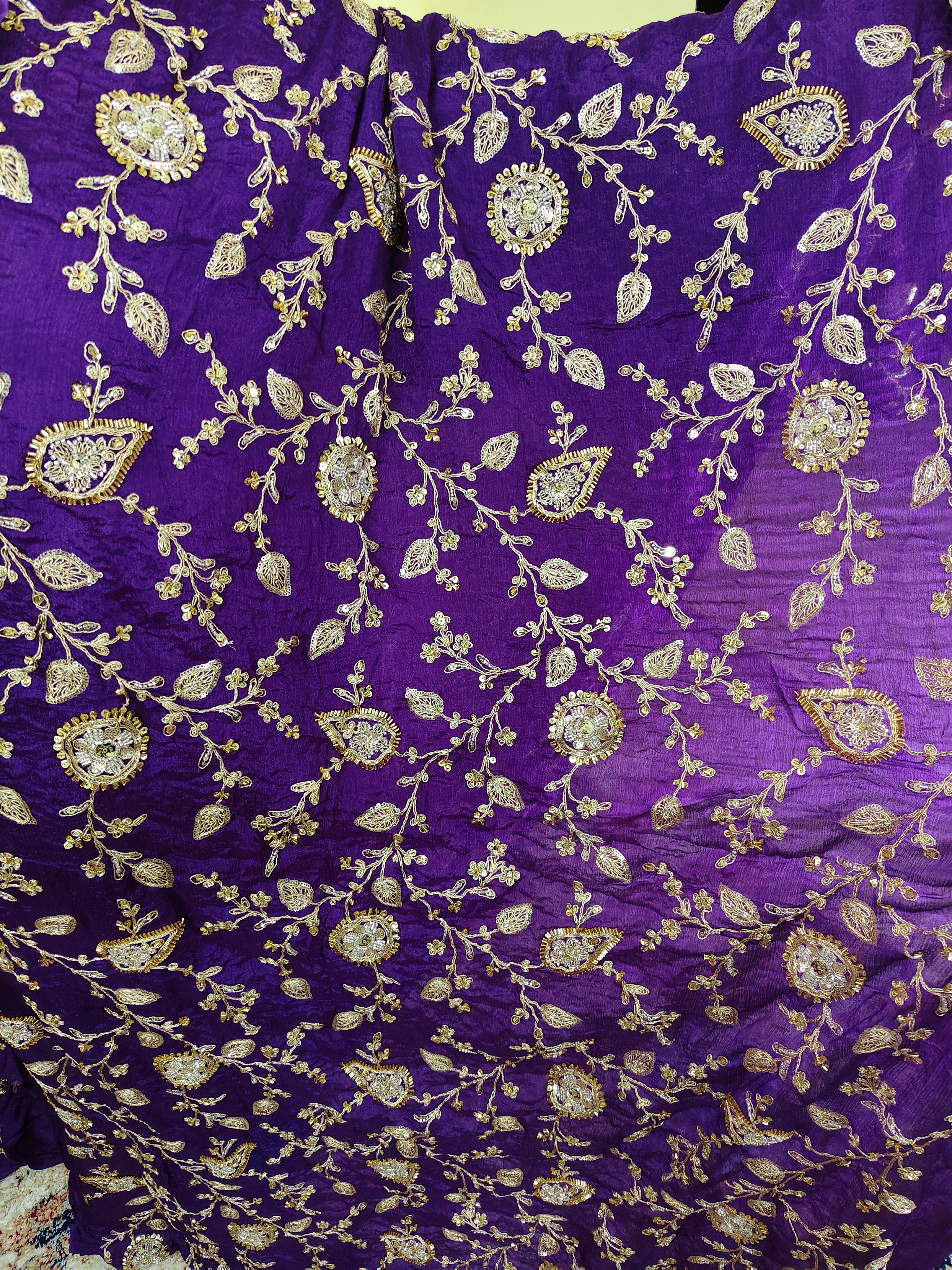 Royal Purple Zari Embroidered Chiffon Fabric