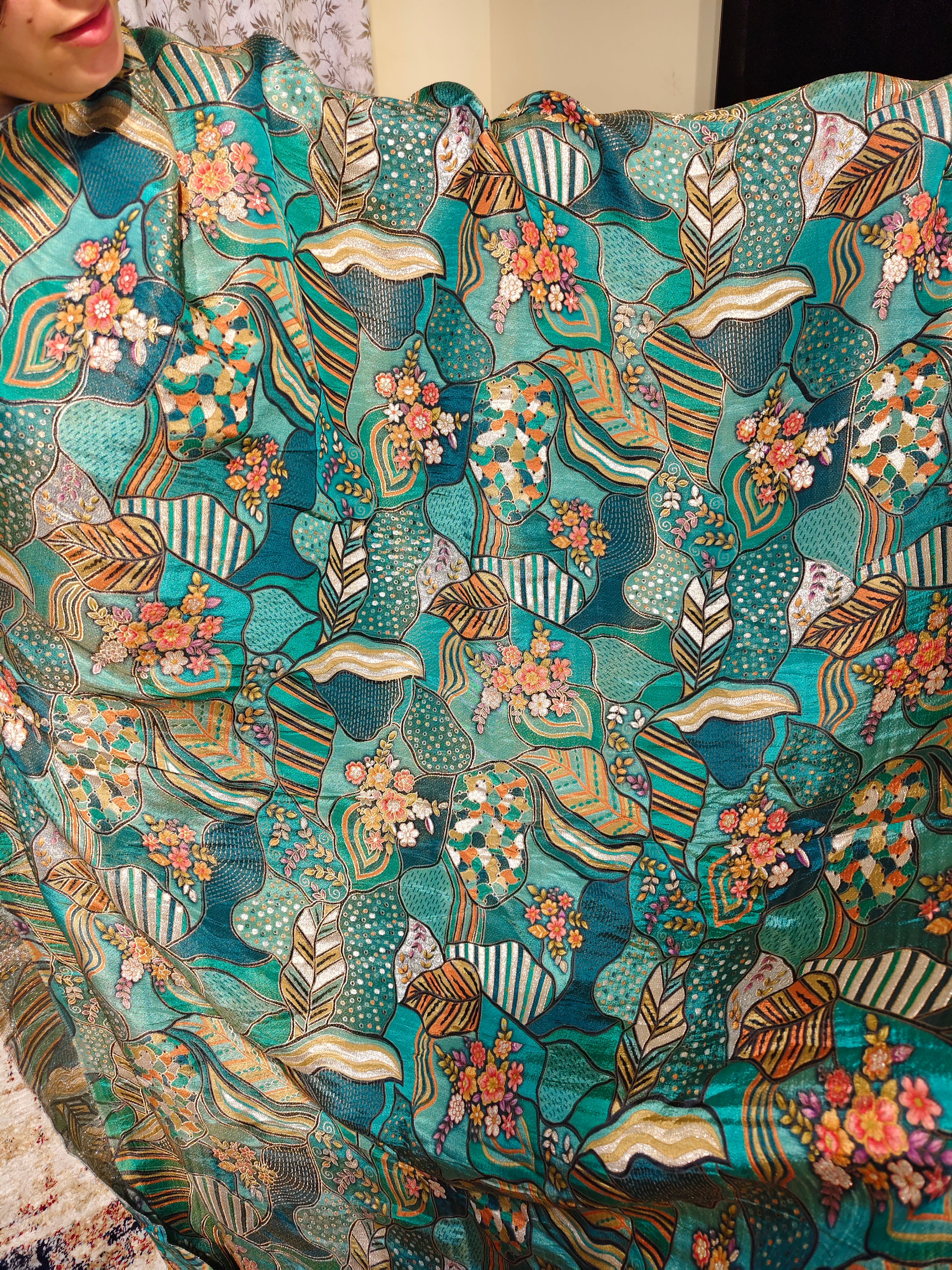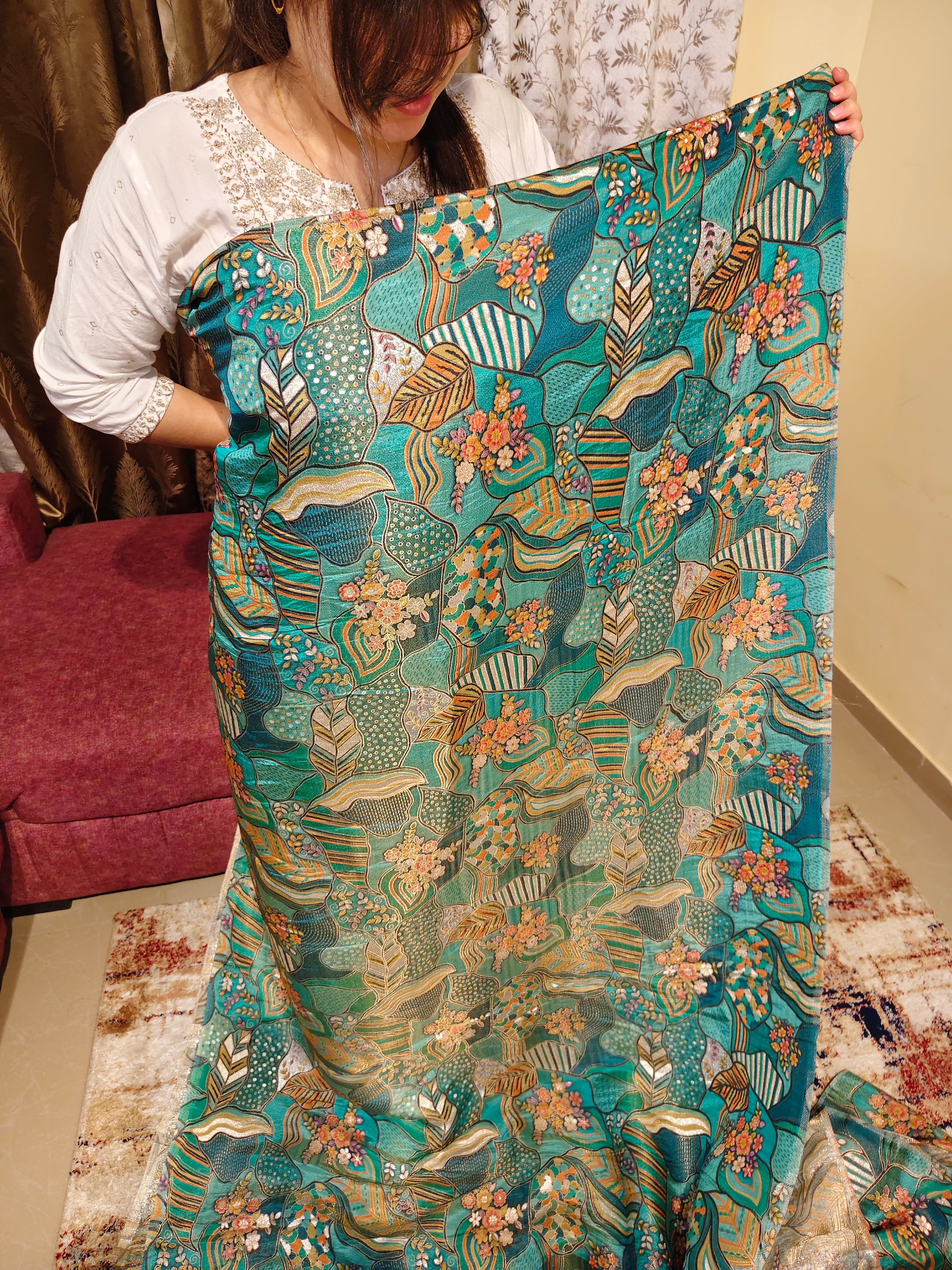 Turquoise Silk Crepe Embroidered Fabric