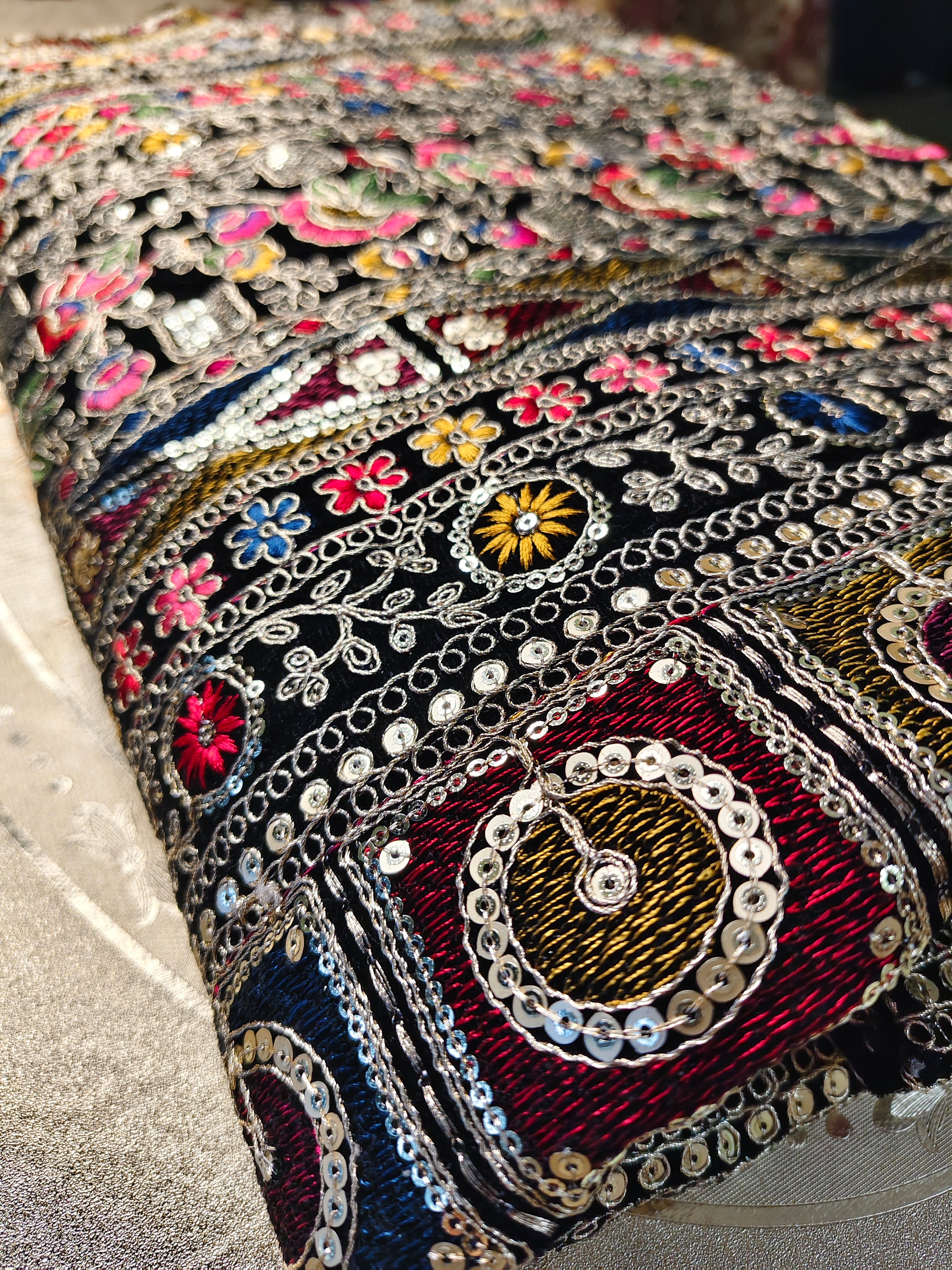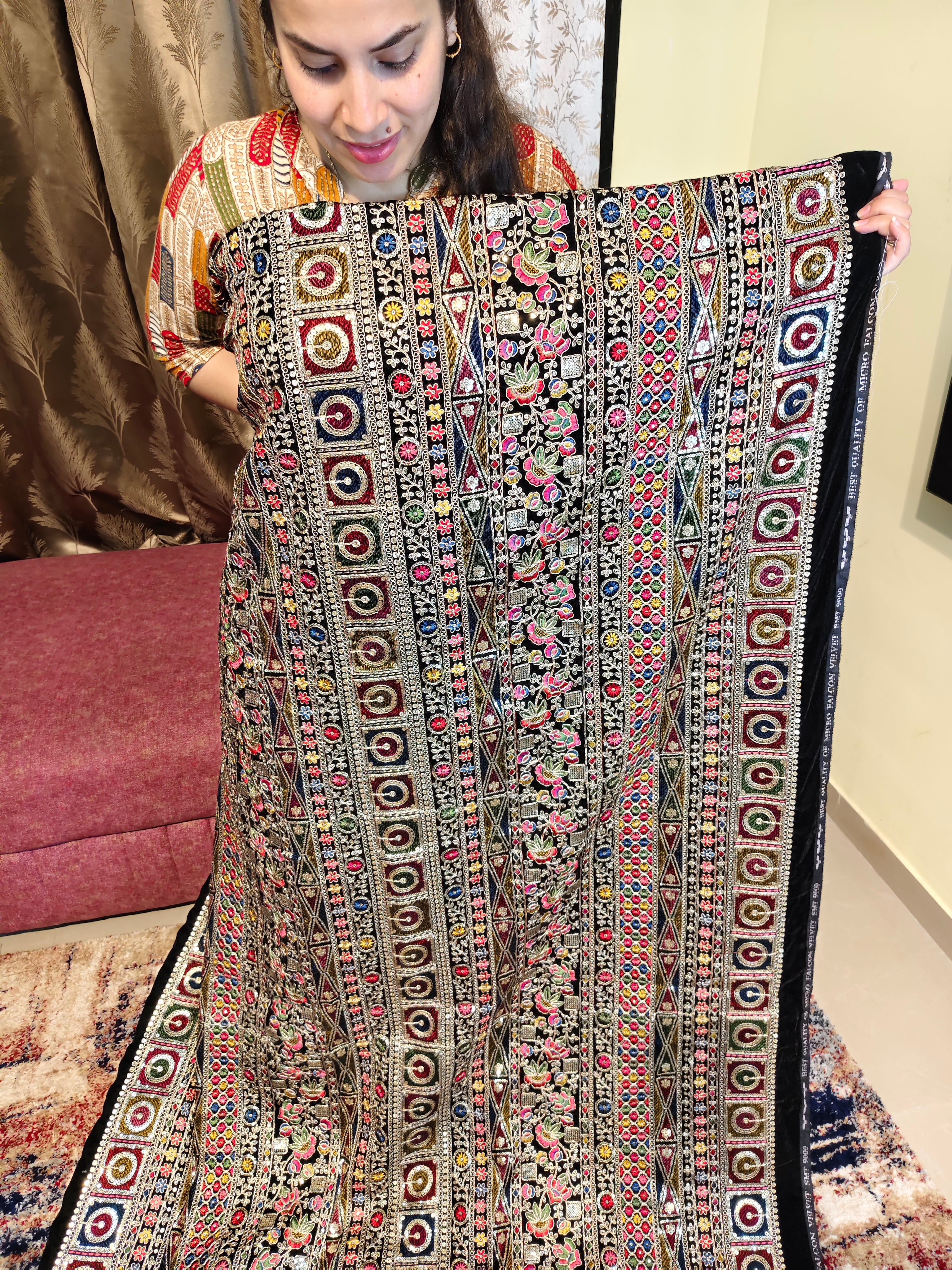 Midnight Black & Multicolour Heritage Embroidered Velvet Fabric with multicolored thread work . Heavy Zari and sequins work.1 Piece Length 4 meters width 1.2 meters