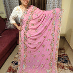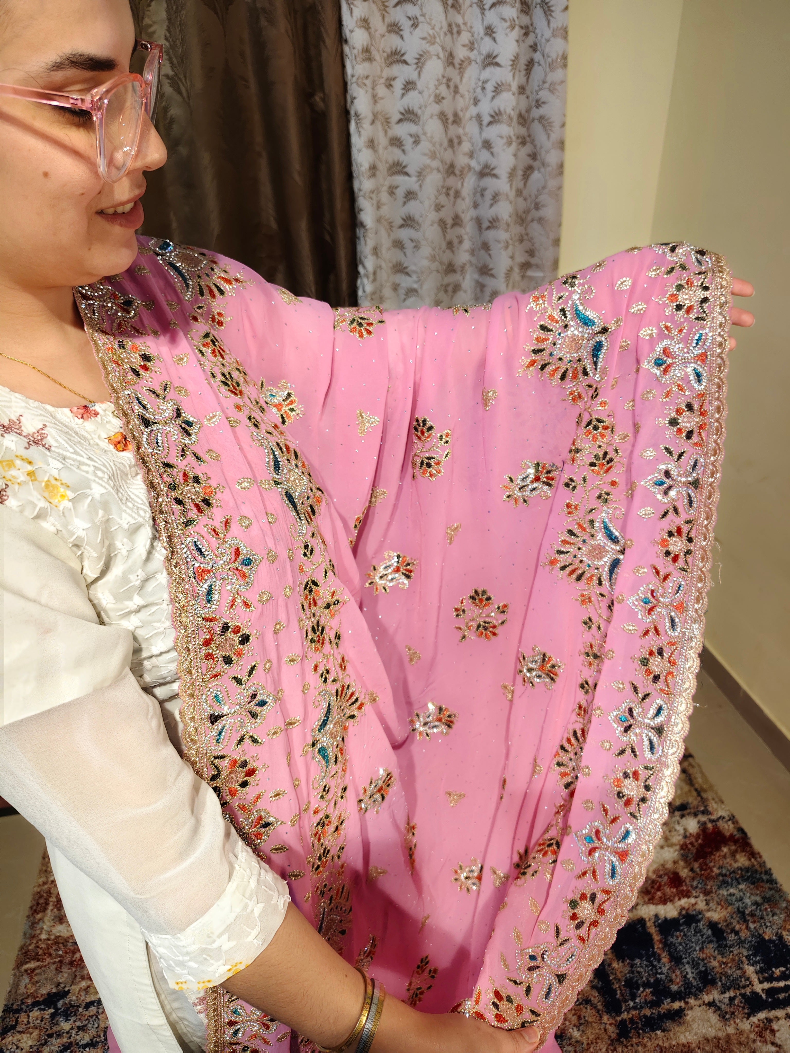 Blush Pink Georgette Saree with Multicolor Floral threadwork Embroidery and embellished with crystals. 1 Piece Length 6 meters width 1.1 meters