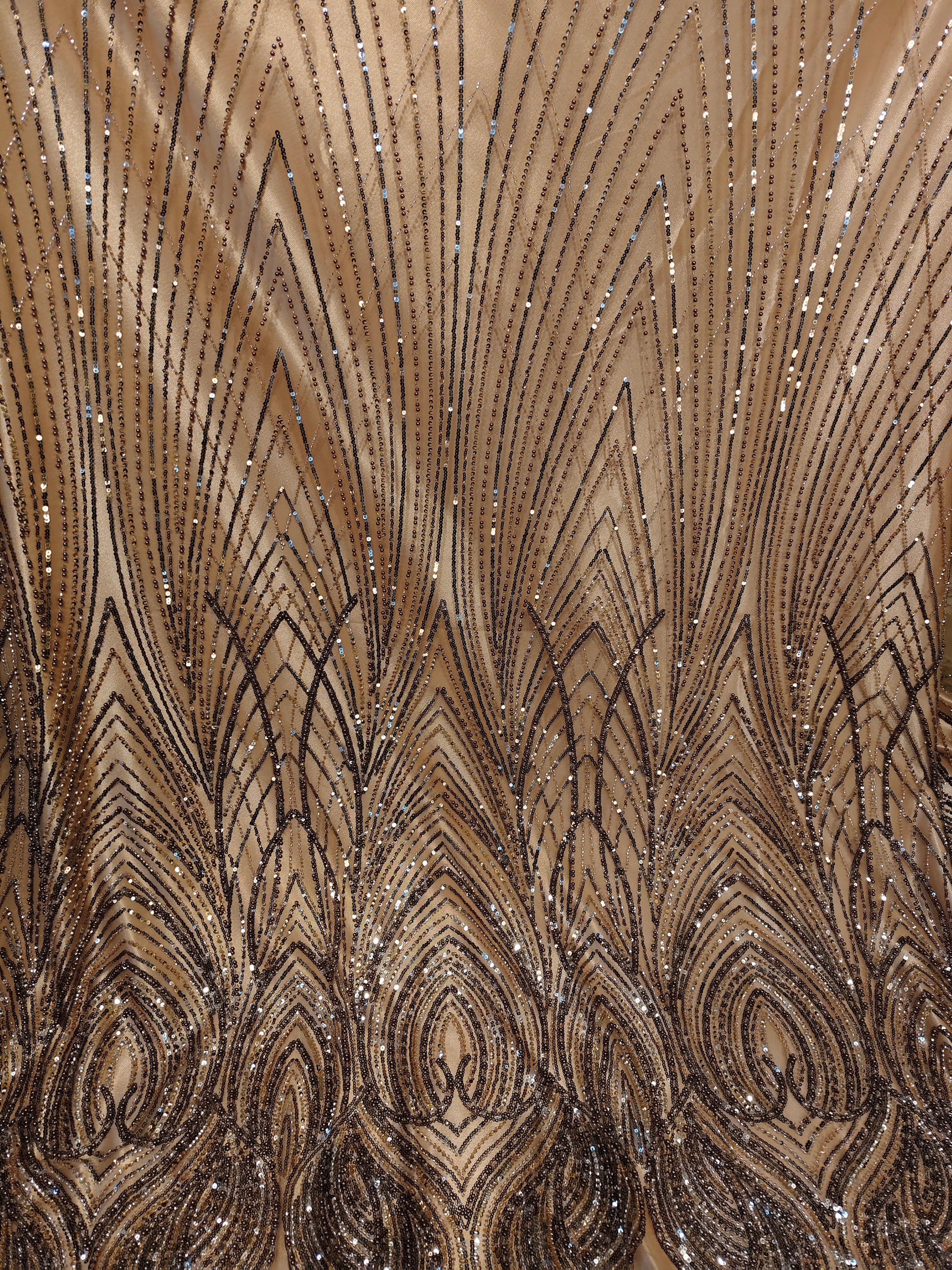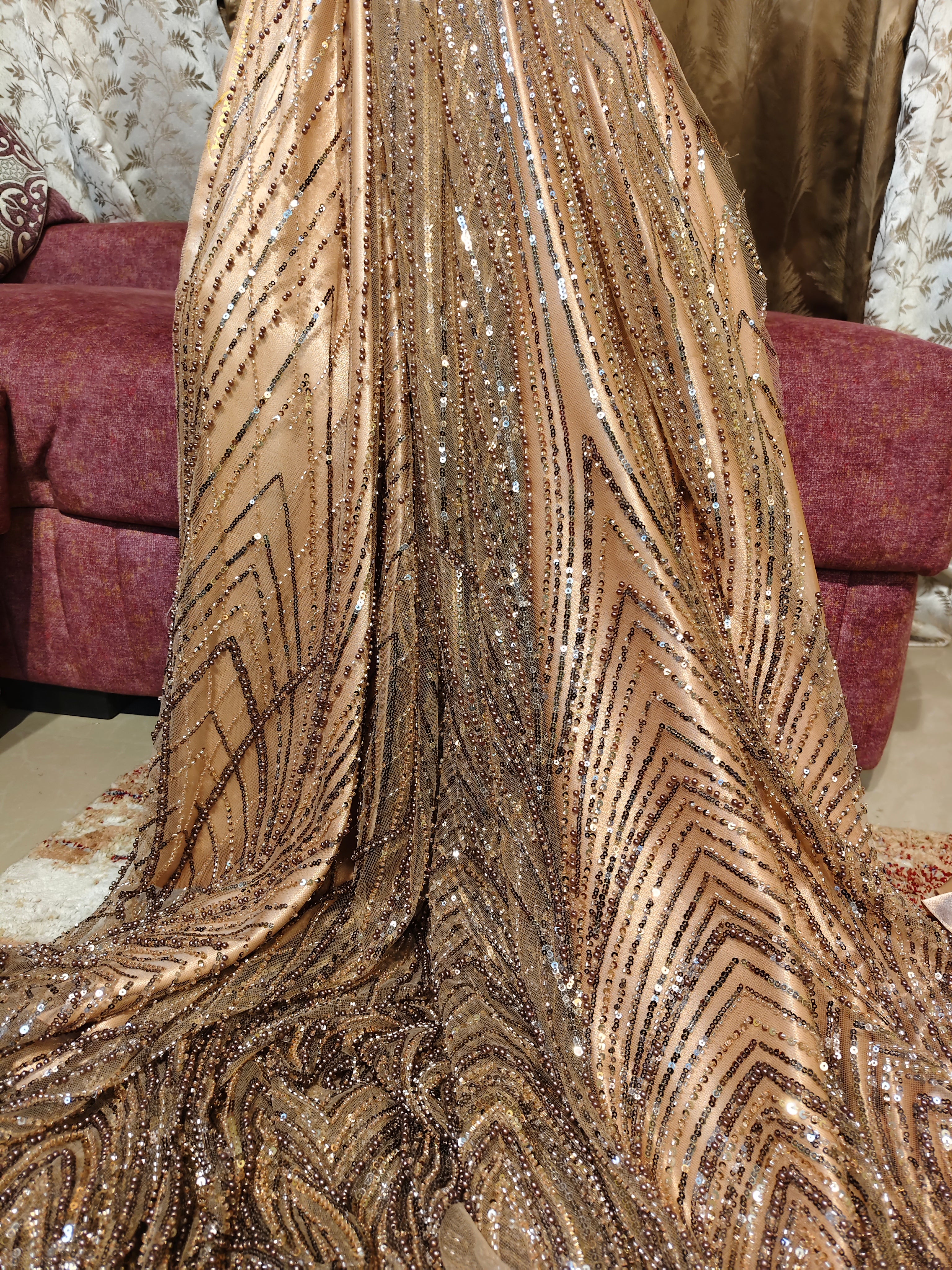Champagne Gold Satin backed Net fabric. handwork with heavy sequins and beads embellishment with Feather Chevron Pattern +Champagne gold Satin Fabric . 2 Pieces length 3.5 meters and width 1.5 meters.
